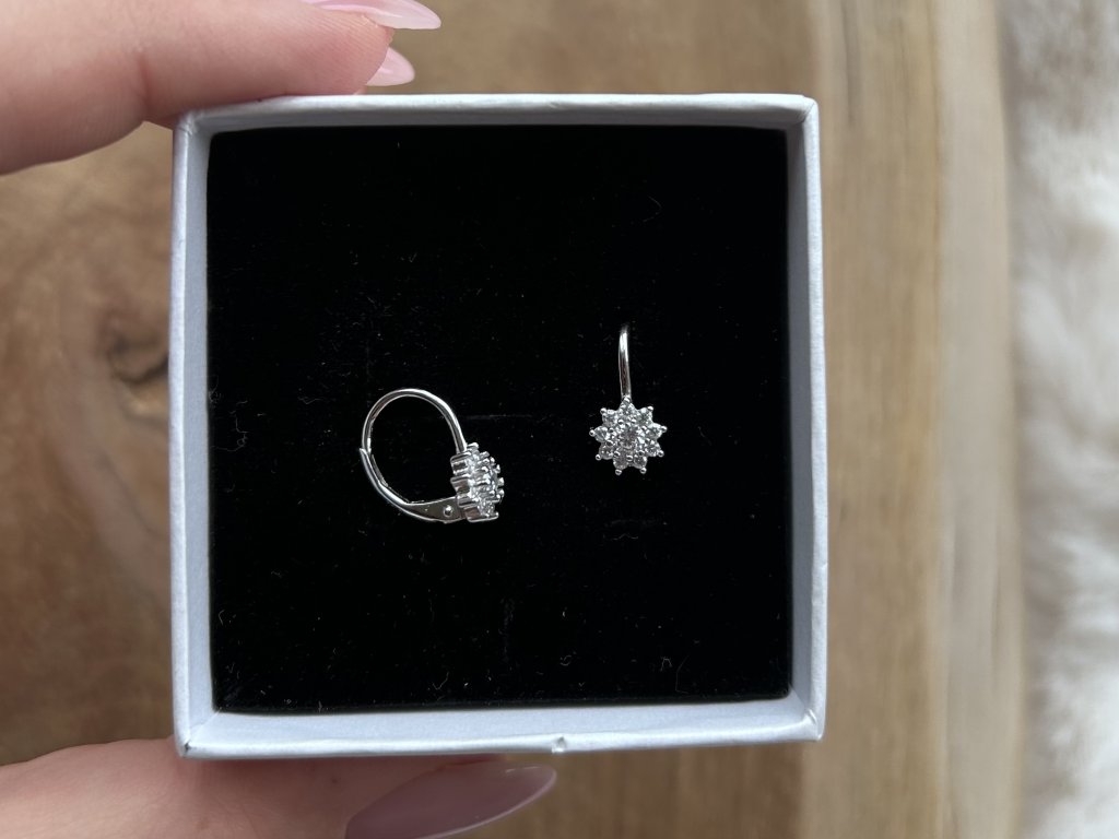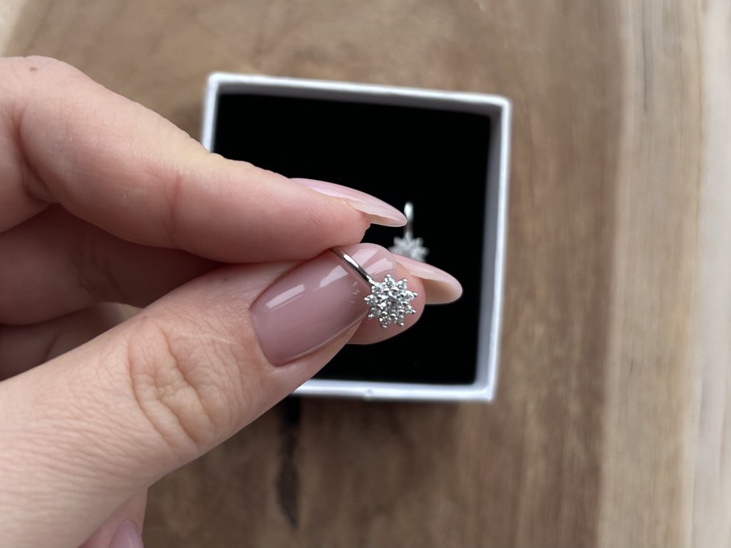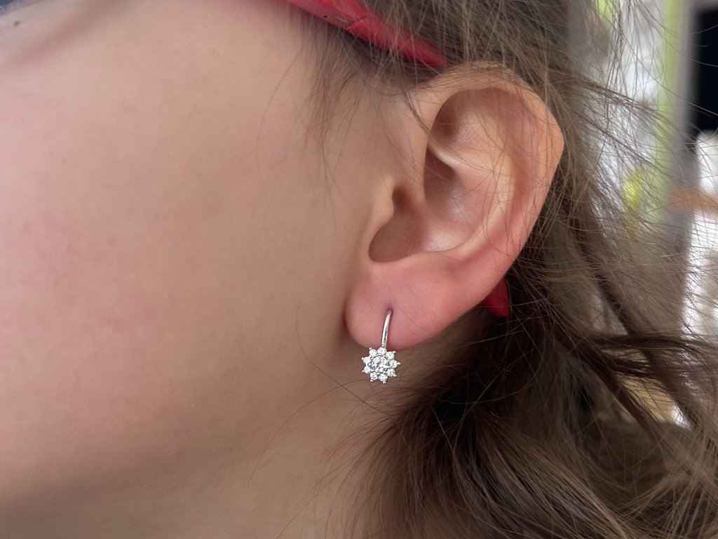 Design: Jemný květinový motiv složený z drobných zirkonů v bílé barvě. Decentní a hravý vzhled vhodný pro děti.