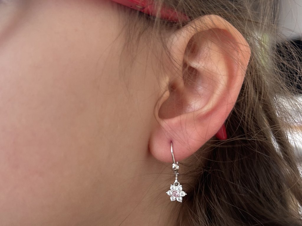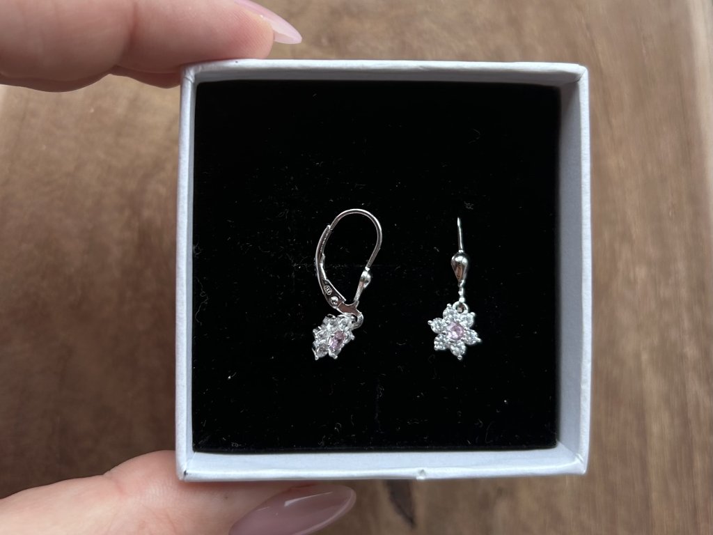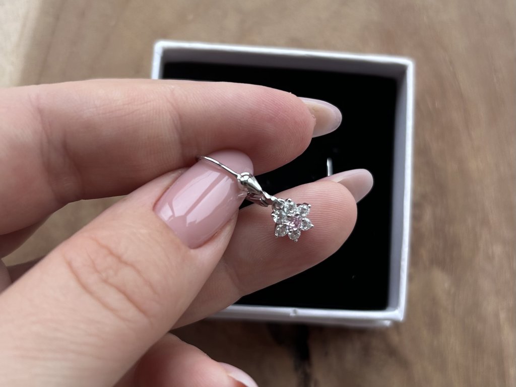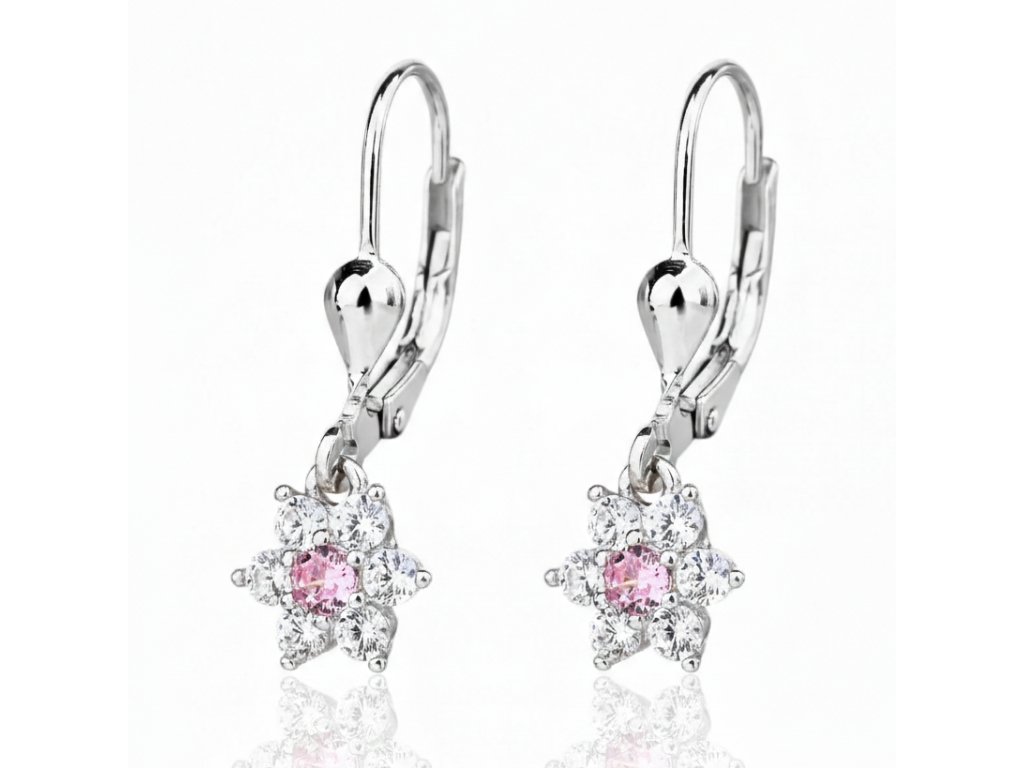 Design: Květinový motiv s růžovým středovým zirkonem, obklopeným drobnými čirými zirkony. Jemný a hravý design vhodný pro děti.