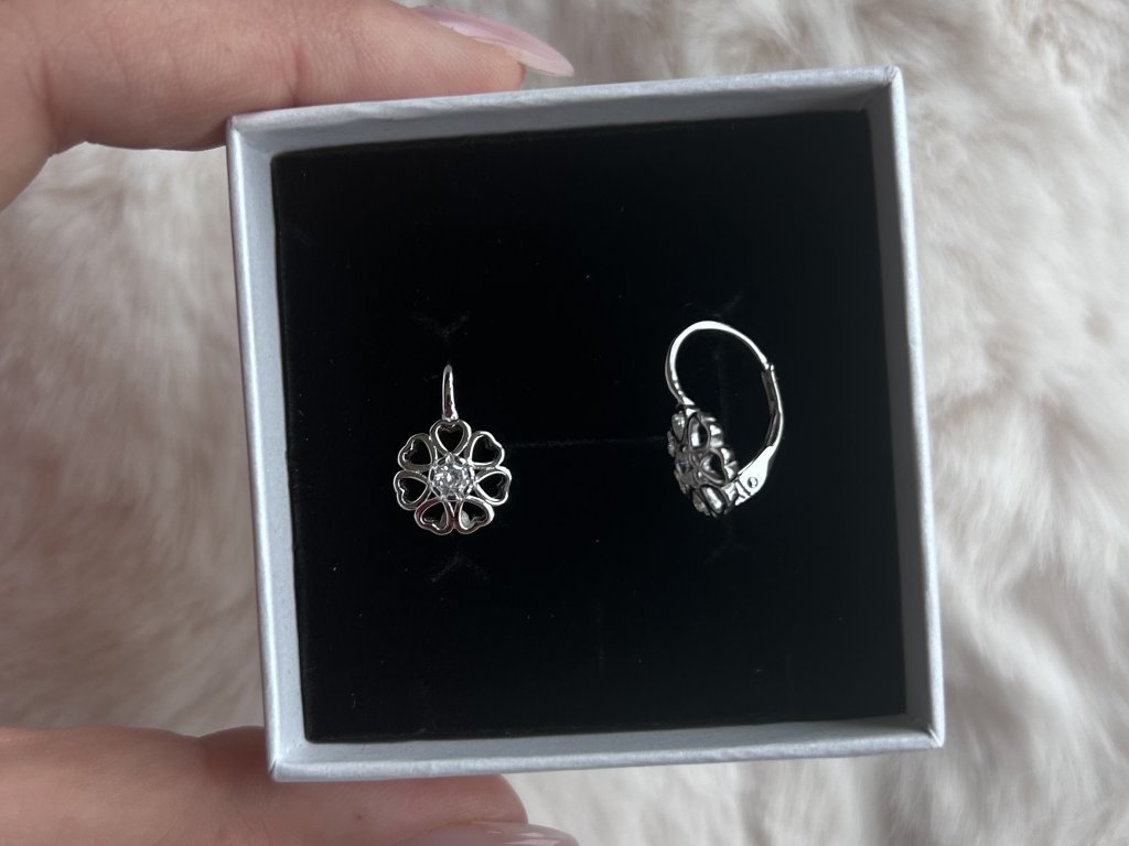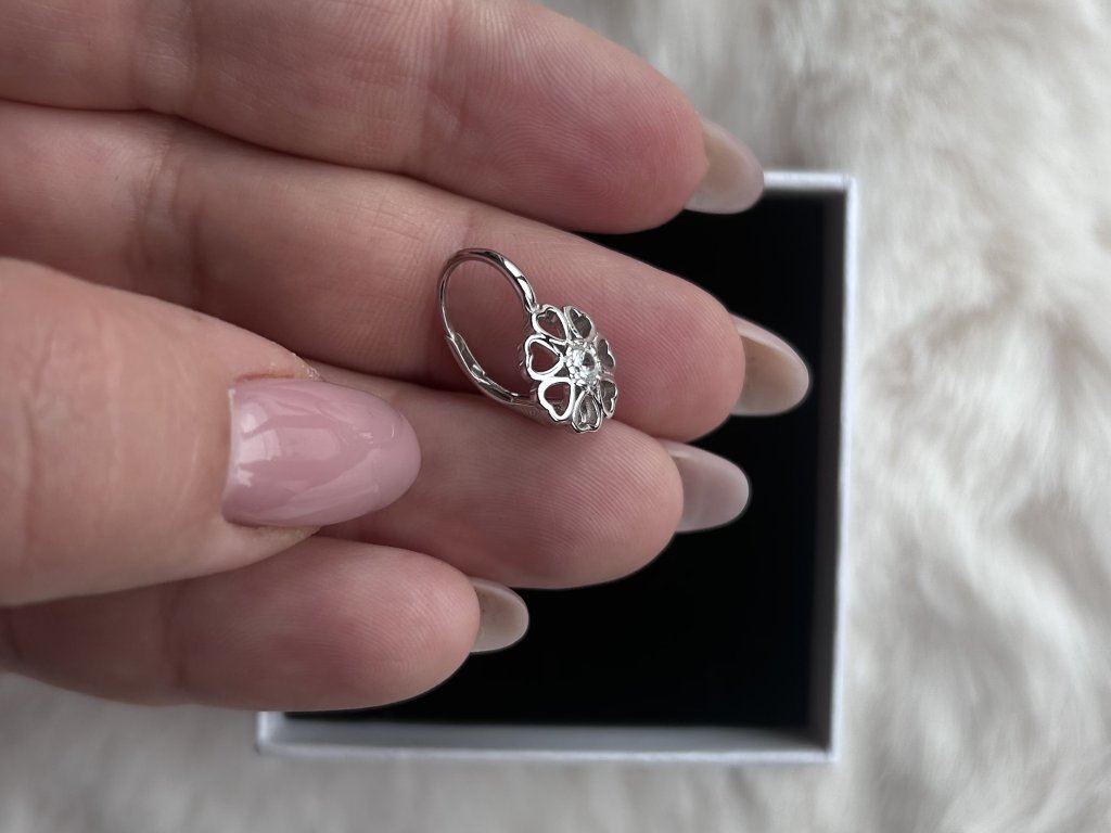 Design: Květinový motiv tvořený drobnými srdíčky, doplněný centrálním čirým zirkonem. Jemný a originální dětský design s nádechem hravosti.