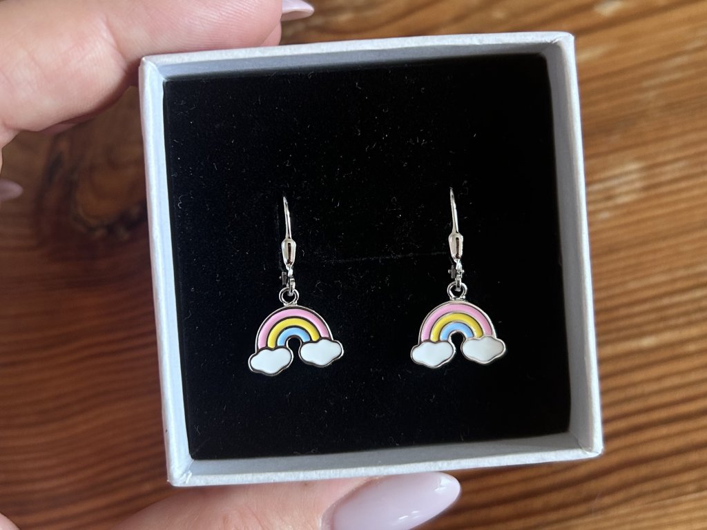 Design: Roztomilé visací náušnice ve tvaru duhy s bílými obláčky a pastelovou výplní v růžové, žluté a modré barvě. Jemný a optimistický design, který podtrhne dětský úsměv.