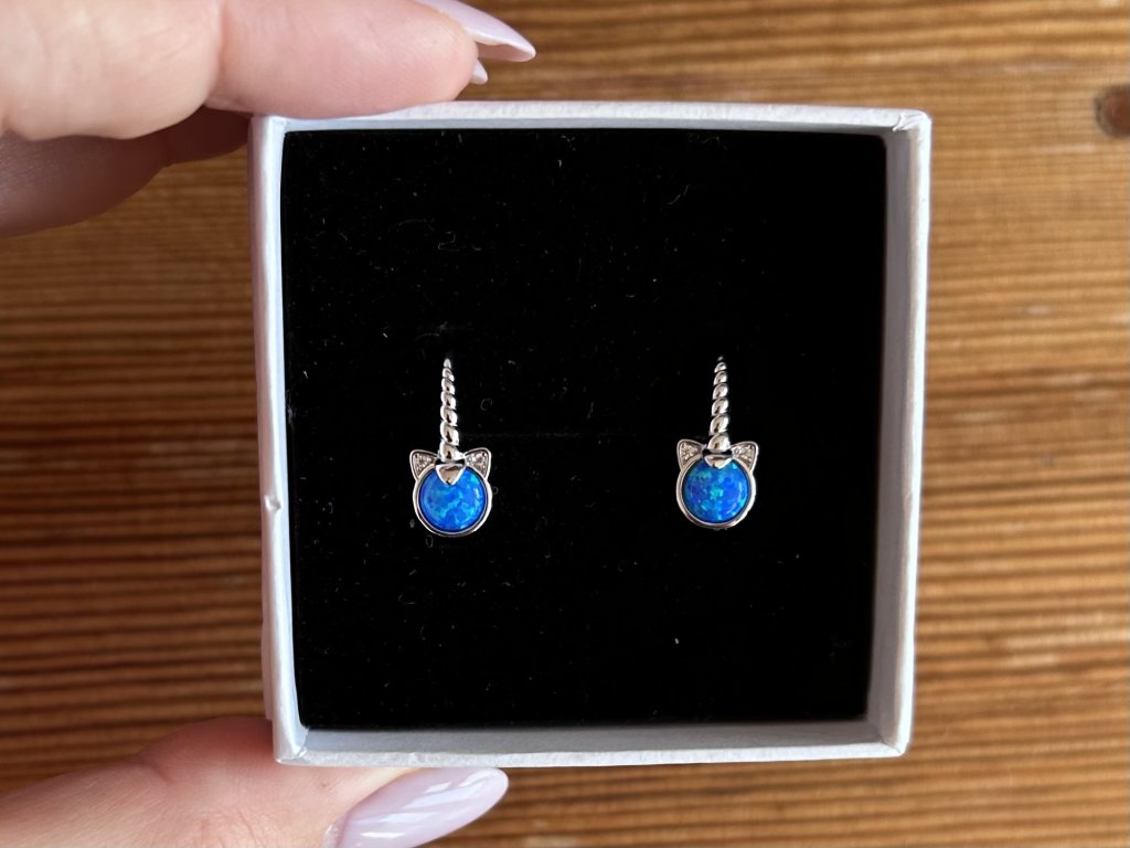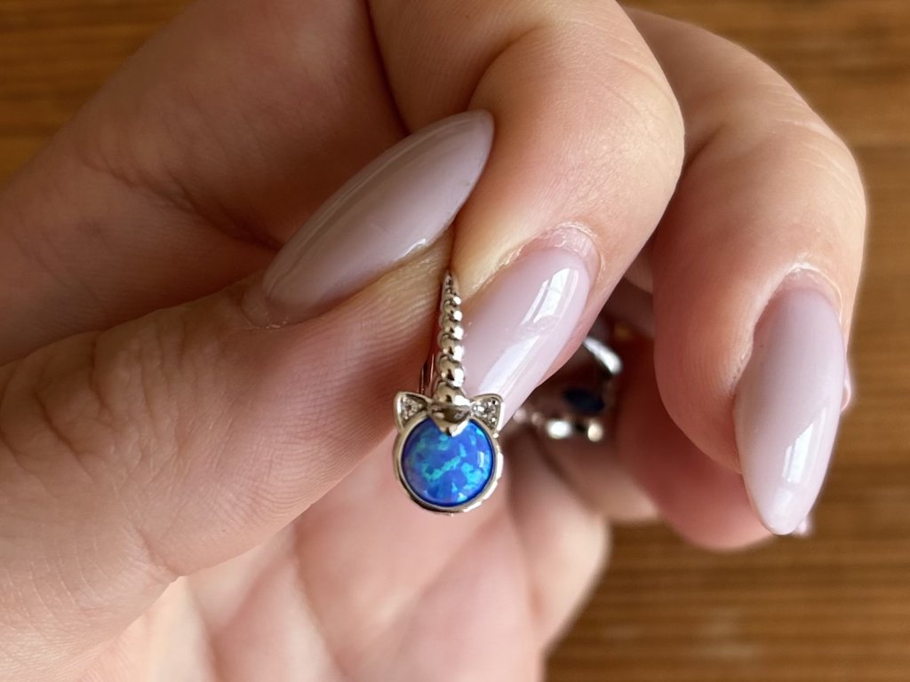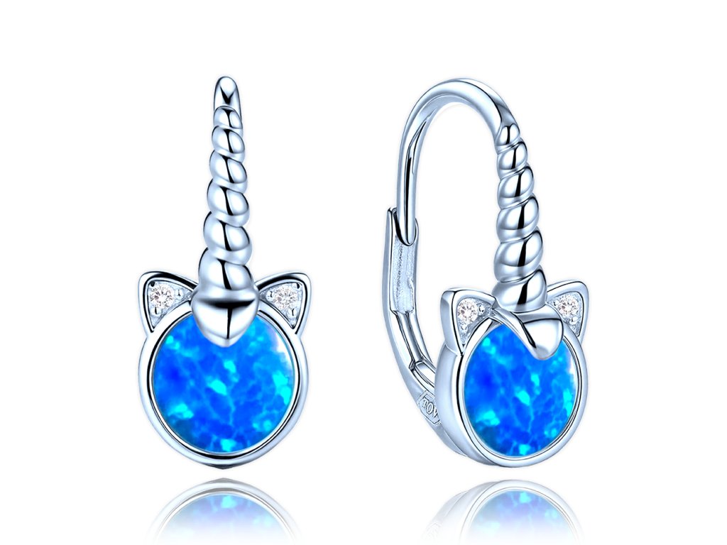 Dětské stříbrné náušnice s modrým opálem a motivem jednorožce