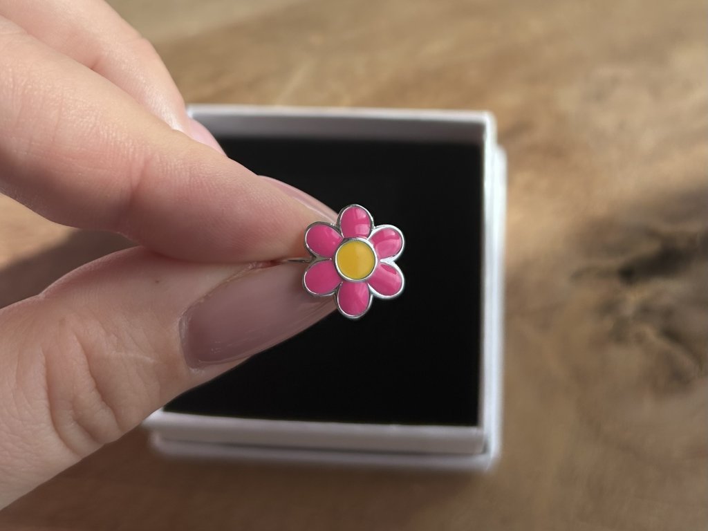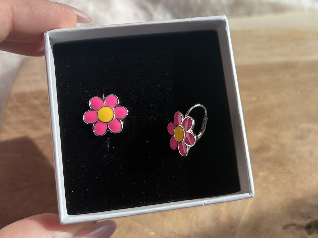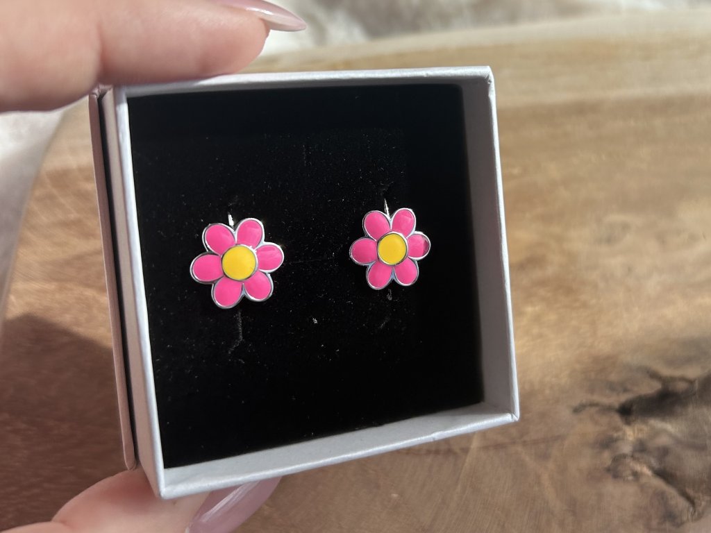 Design: Náušnice ve tvaru šesti okvětních lístků mají sytě růžové zabarvení s kontrastním žlutým středem. Jemné zaoblení a lesklý povrch dodávají kytičce roztomilý vzhled, který krásně vynikne na uchu dítěte.