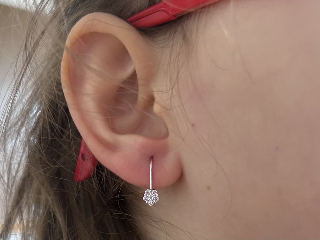 - Rozměr: Náušnice mají výšku 15 mm a šířku 5 mm, což je ideální velikost pro dětské uši. Hmotnost náušnic je 1,25 g, díky čemuž jsou velmi lehké a příjemné na nošení po celý den.