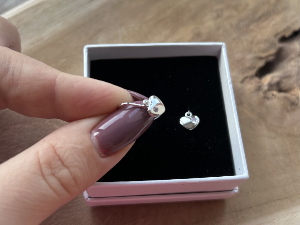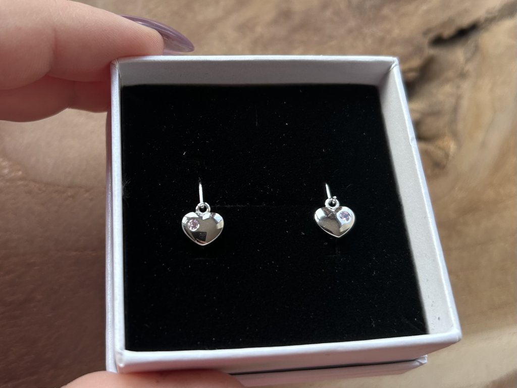 Design: Srdíčkový motiv s drobným růžovým zirkonem, který dodává náušnicím jemný, něžný charakter.