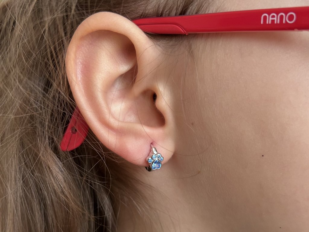 Design: Náušnice typu kroužky s přívěskem ve tvaru tlapky, zdobené modrými zirkony včetně srdcovitého zirkonu uprostřed. Hravý, roztomilý a dětsky jemný vzhled.