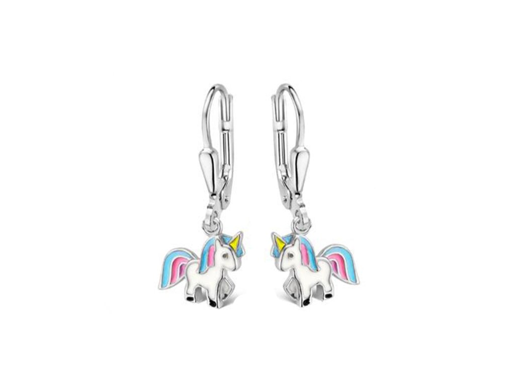 Design: Veselé visací náušnice s motivem jednorožce, zdobené barevným smaltem v jemných pastelových tónech.