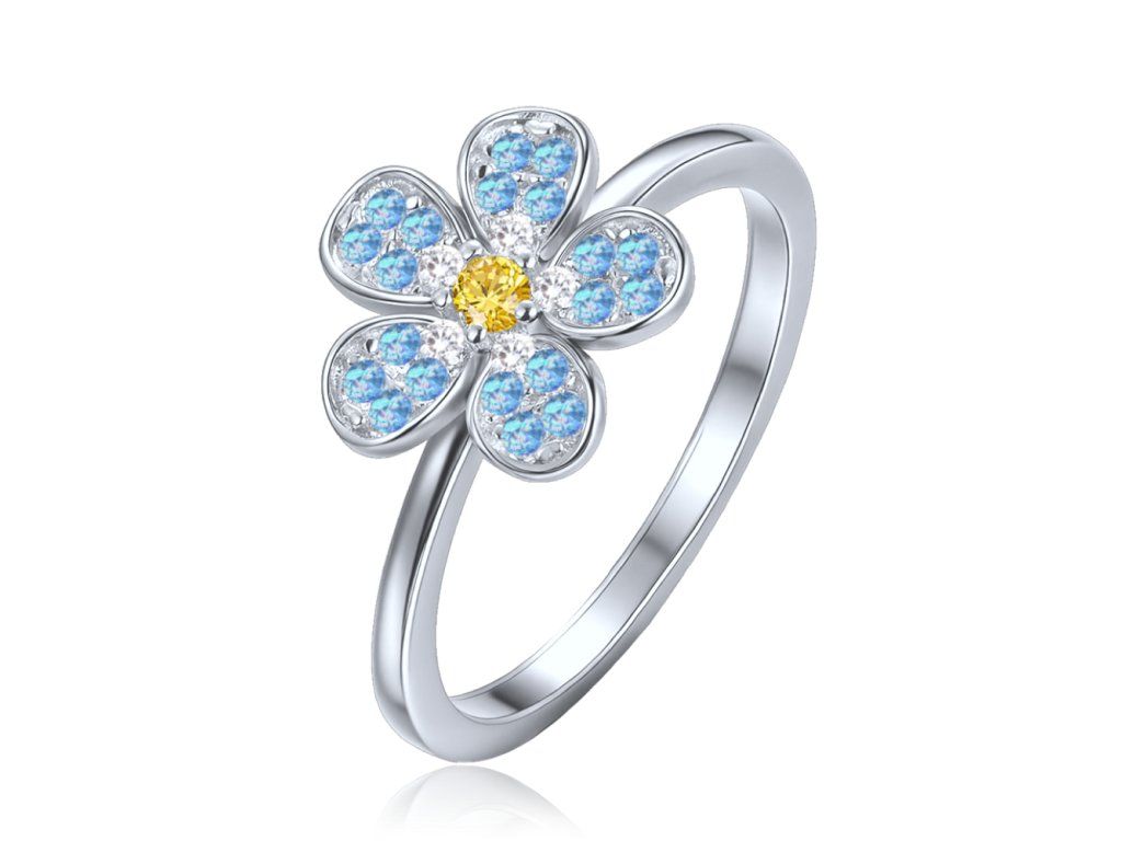 • Design: Květina zdobená modrými a čirými zirkony, se žlutým středem.