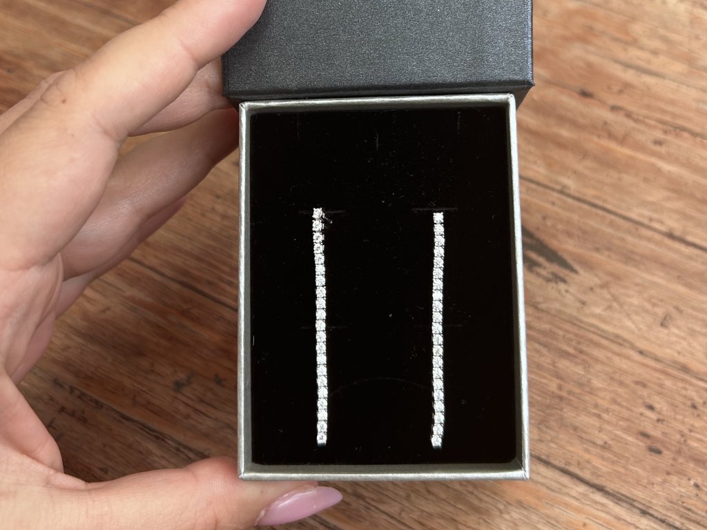 Design: Štíhlé visací náušnice osazené řadou třpytivých zirkonů. Jejich čistý a moderní vzhled působí luxusně a podtrhuje jemnou ženskou krásu.