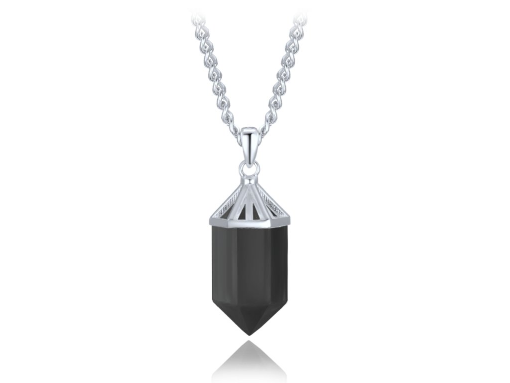Design: Luxusní náhrdelník s přívěskem z přírodního broušeného obsidiánu, který se vyznačuje hlubokou černou barvou a jemným leskem. Kámen je zasazen do elegantní korunky zdobené drobnými zirkony, které mu dodávají decentní třpyt. Robustnější řetízek podtrhuje výrazný vzhled a zajišťuje pohodlné nošení.