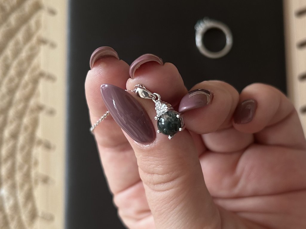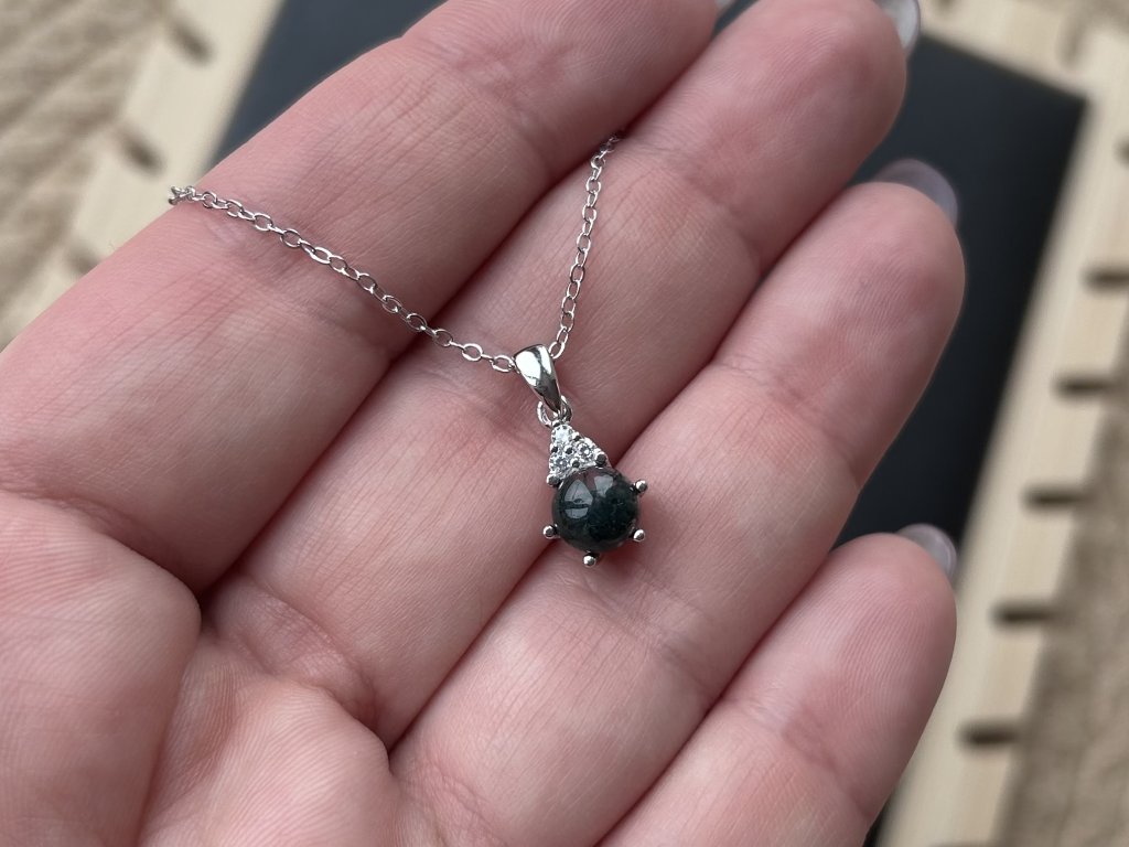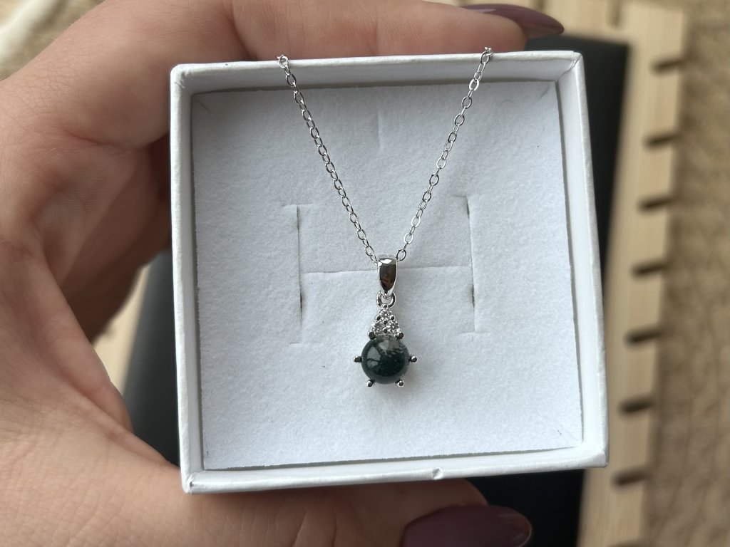 Materiál: Náhrdelník je vyroben ze stříbra 925/1000 s povrchovou úpravou pro ochranu a dlouhodobý lesk. Ozdoben tmavým mechovým achátem a čirými zirkony.