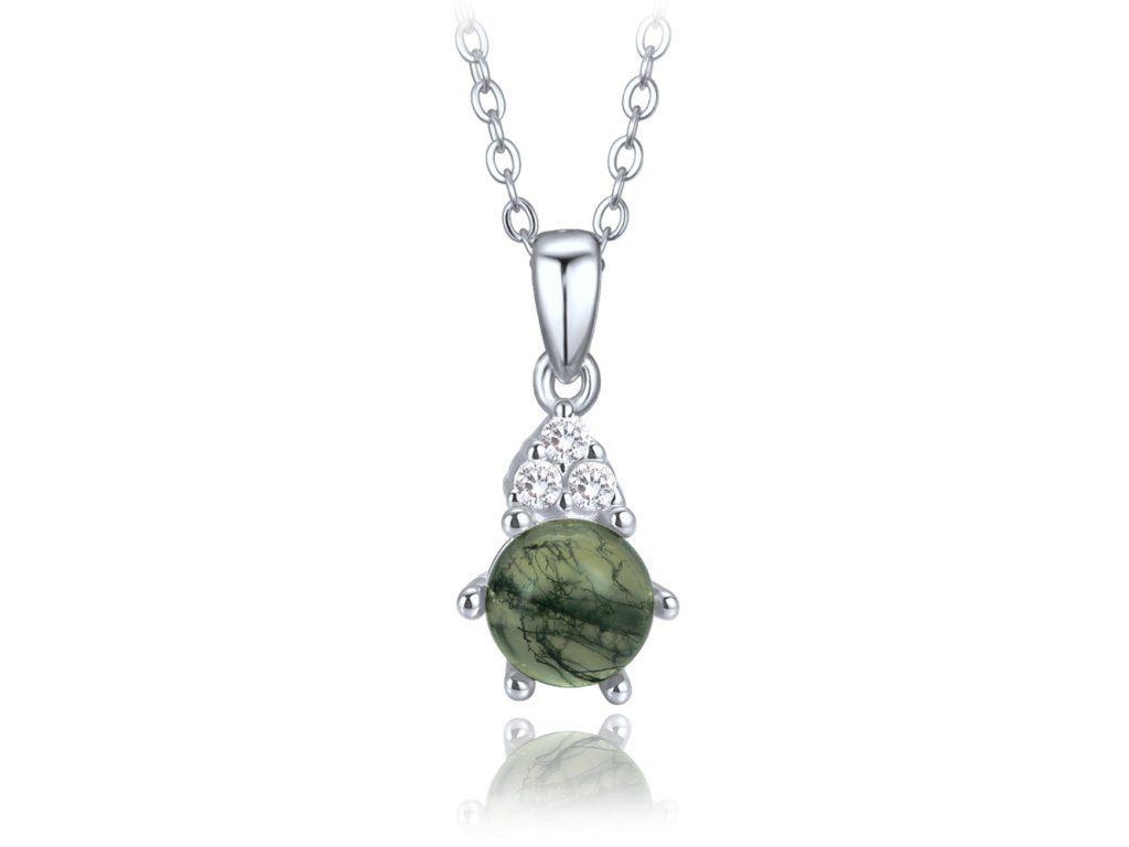 Design: Kulatý tmavý mechový achát je zasazen do elegantního přívěsku doplněného třemi drobnými zirkony, které dodávají vyvážený kontrast a jemný lesk.
