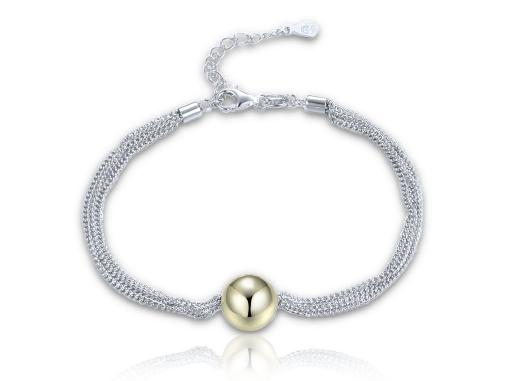 - Design: Náramek tvoří tři jemné řetízky propojené uprostřed hladkou kuličkou ve zlatém tónu, která vytváří elegantní kontrast ke stříbrné barvě řetízků.