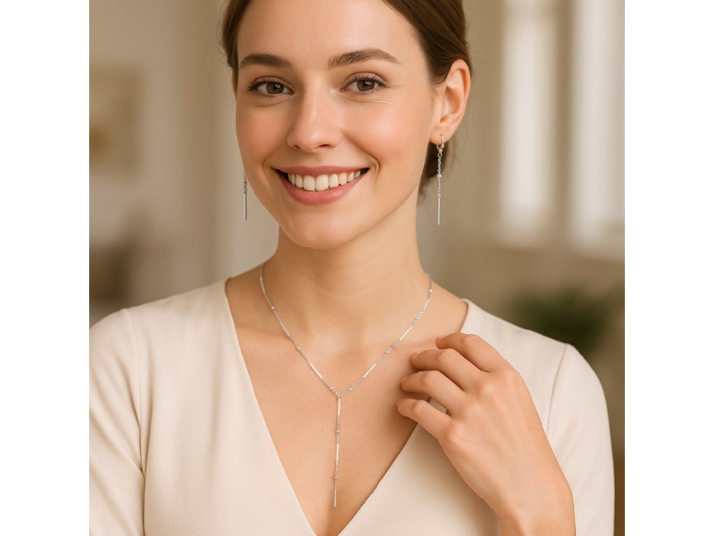 - Design: Náušnice tvoří jemný řetízek s decentní kuličkou a minimalistickou tyčkou, které vytvářejí moderní a čistý vzhled.