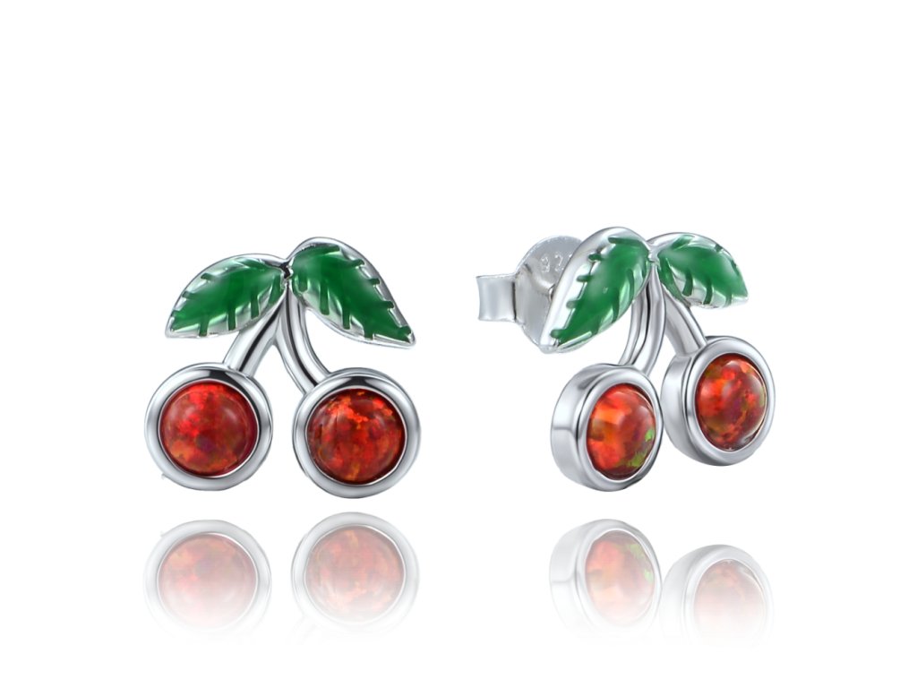 - Design: Náušnice ve tvaru třešní s detailně zpracovanými zelenými lístky a červeným opálem, doplněné čirými zirkony pro jemný třpyt.