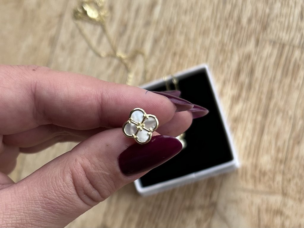 Design: Náušnice s motivem čtyřlístku – symbolem štěstí a harmonie. Perleť vytváří jemné odlesky, které se mění s každým pohybem, zatímco zlacení dodává náušnicím luxusní nádech.