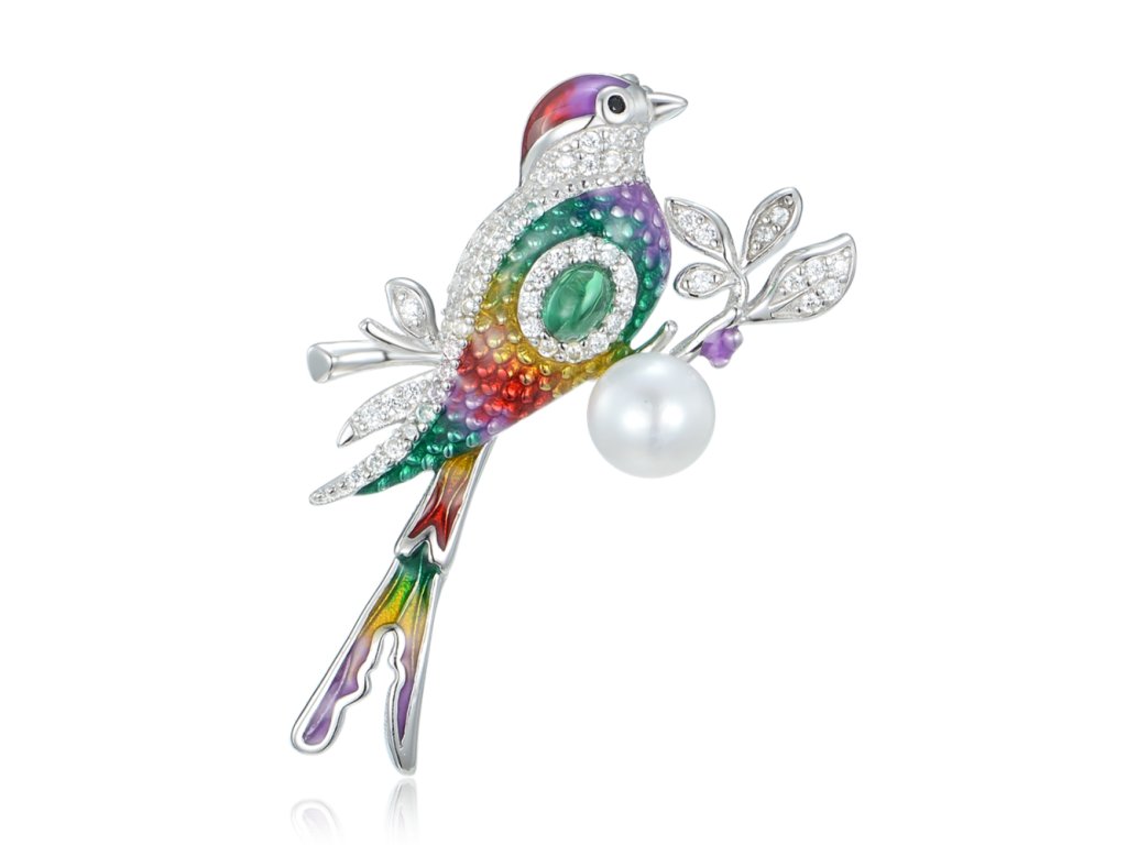 Design: Tato brož představuje nádherného ptáčka s bohatě barevnou glazurou, která jemně přechází od zelených až po fialové a zlatavé tóny. Celý motiv doplňuje třpyt čirých detailů a dominanta v podobě přírodní perly, která dodává šperku nádech luxusu a elegance. Symbol ptáčka je od nepaměti spojován se svobodou, štěstím a harmonií – brož proto není jen šperkem, ale i nositelem pozitivního významu.