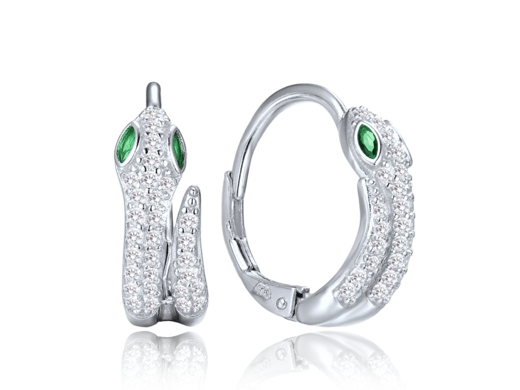 Design: Dámské náušnice ve tvaru hada s detailně propracovaným tělem a zelenými očima, osazené čirými zirkony pro výrazný třpyt.