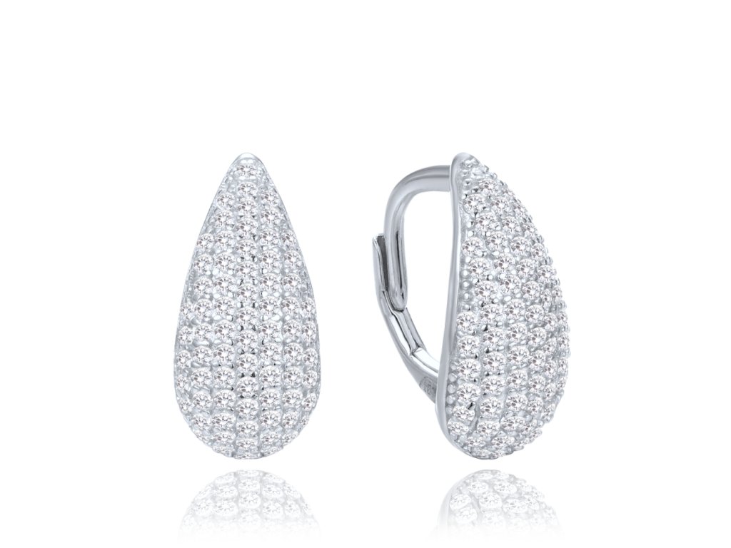 • Design: Náušnice jsou navrženy v elegantním tvaru kapky, který lichotí tvaru obličeje a zároveň působí nadčasově. Celá plocha je osazena drobnými čirými zirkony, které vytvářejí bohatý a výrazný třpyt. Jemná klenutá linie působí hladce a zároveň slavnostně – ideální pro večerní šaty, ale i elegantní pracovní look.