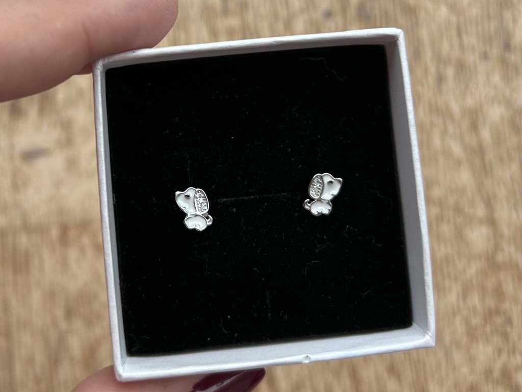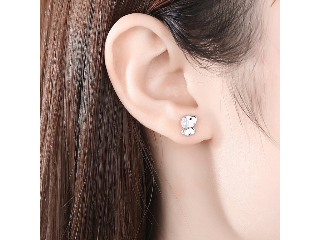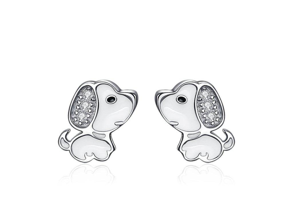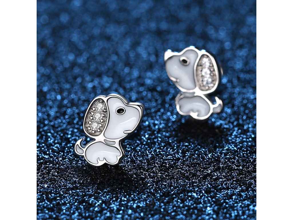 Design: Jemný motiv pejska s hladkými liniemi, detail ouška je osazen drobnými zirkony pro decentní třpyt.