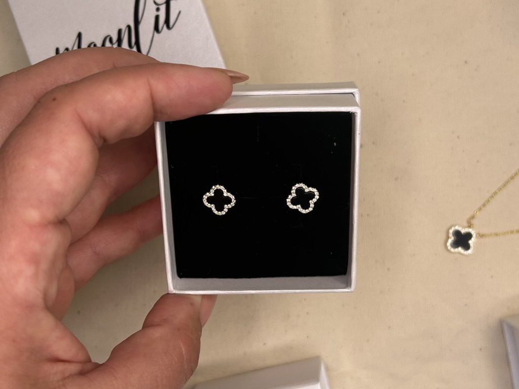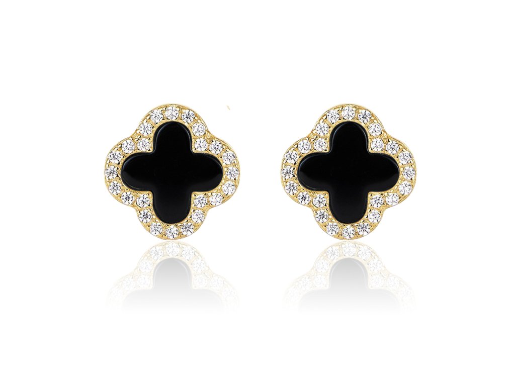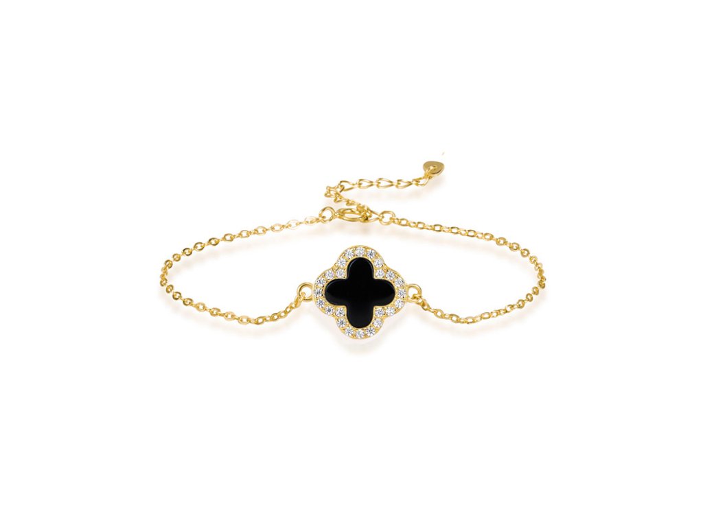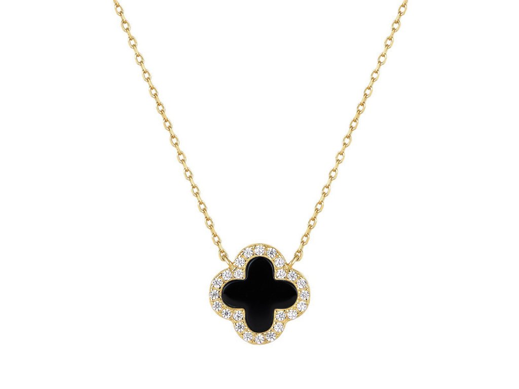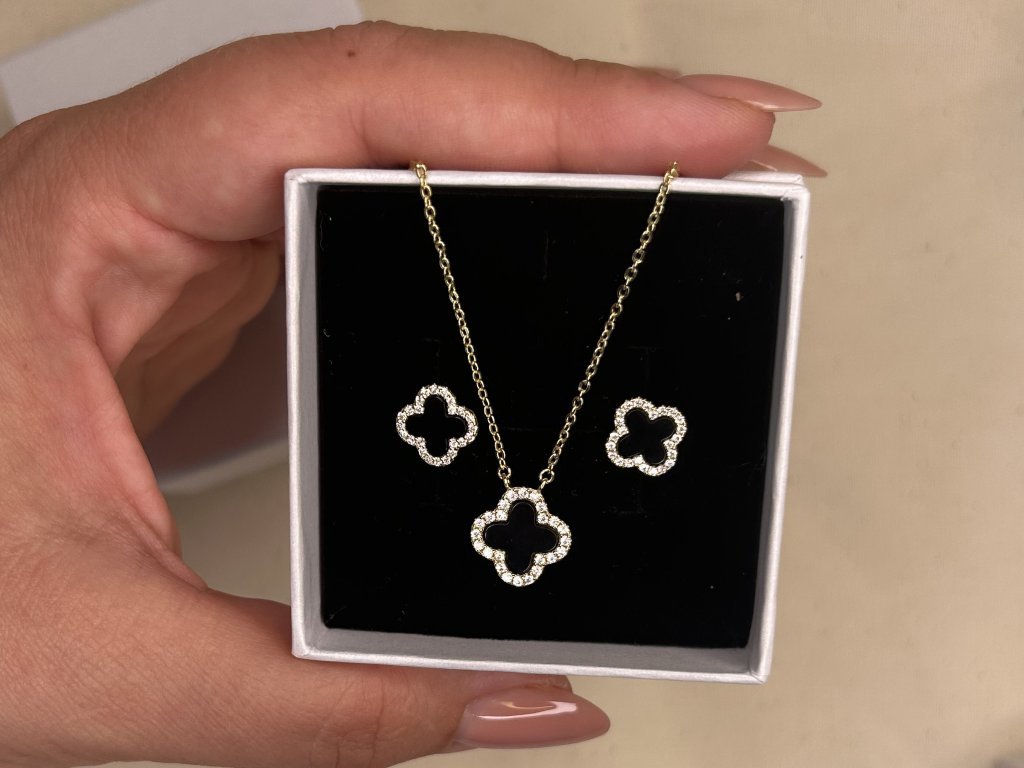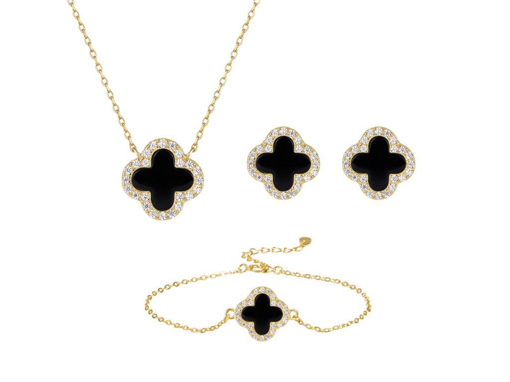 Zvýhodněná sada s černým achátem ve tvaru čtyřlístku se zirkony pozlacená