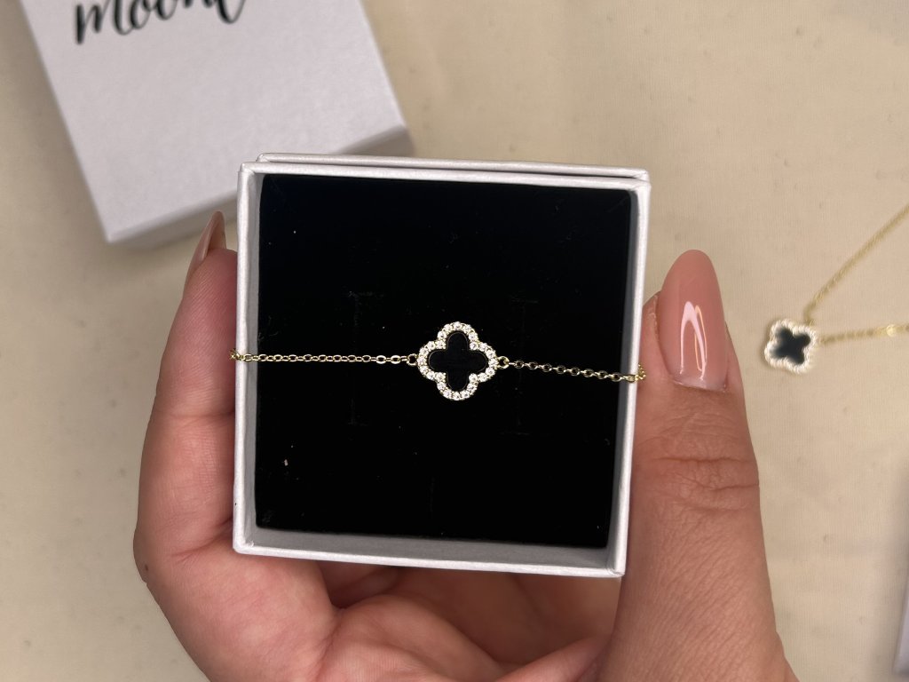 Design: Ikonický motiv čtyřlístku s hladkým černým achátem uprostřed a třpytivým okrajem z čirých kubických zirkonů. Spojení kontrastních barev a harmonických tvarů působí elegantně a přitom moderně.