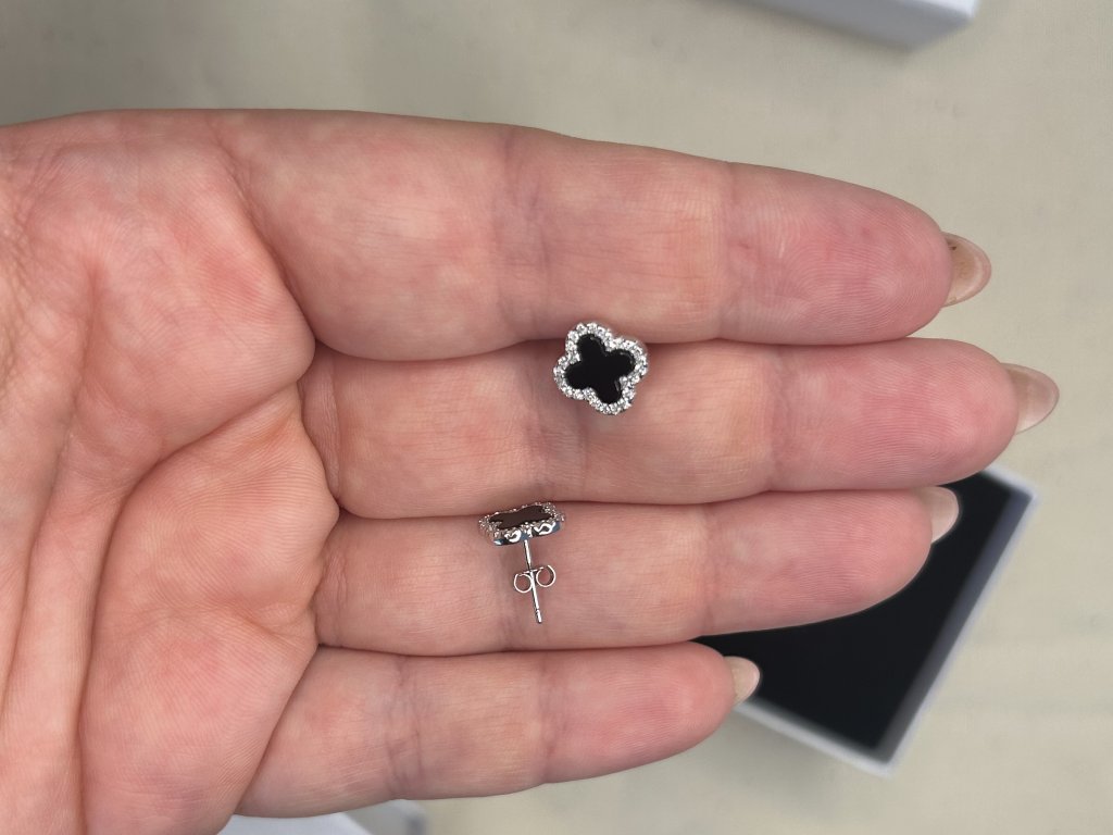 Design: Náušnice mají tvar jemného čtyřlístku s vycentrovaným černým achátem a oslnivým lemováním z čirých zirkonů. Lesklý povrch a kontrastní kombinace barev působí elegantně, moderně a zároveň nadčasově. Precizní zpracování zajišťuje krásný třpyt i při tlumeném světle.