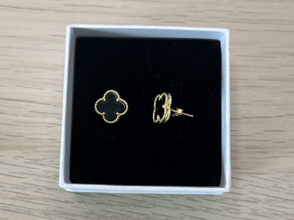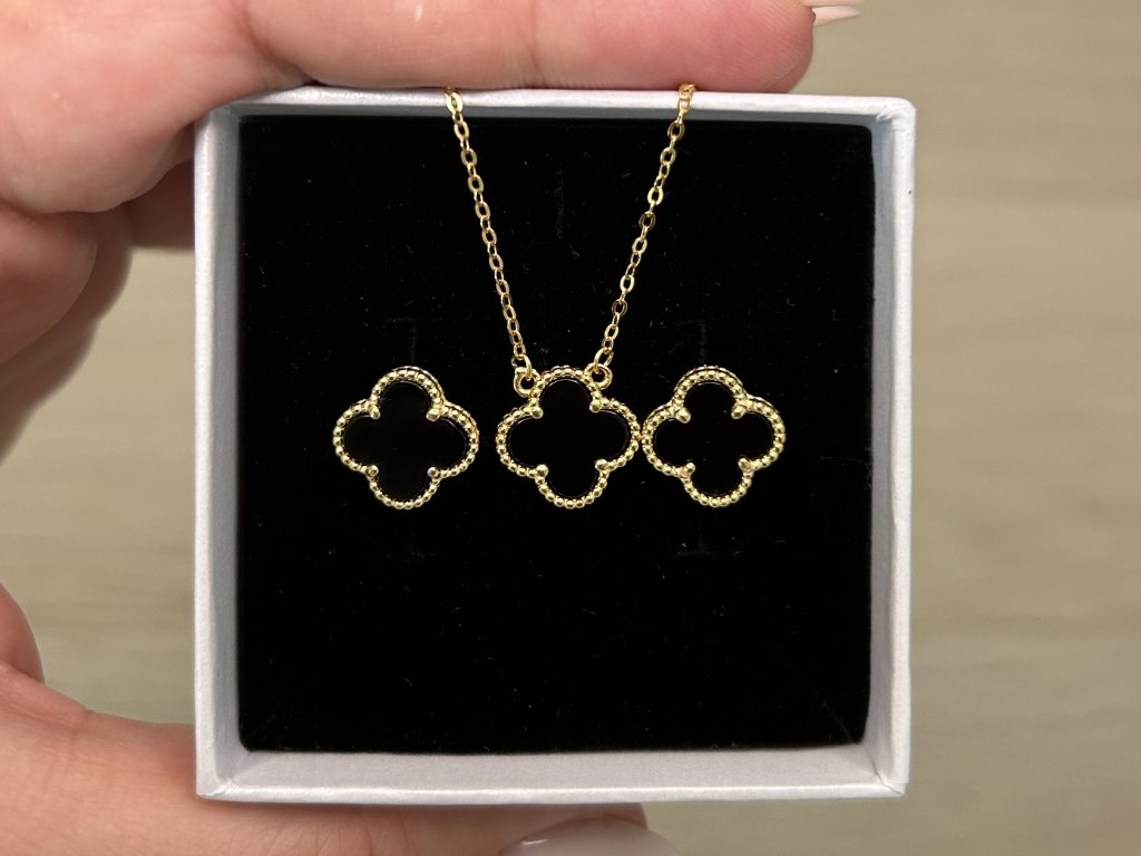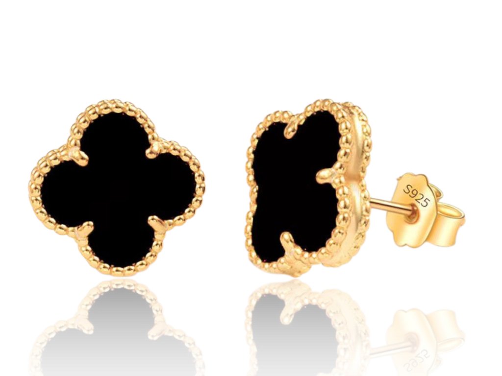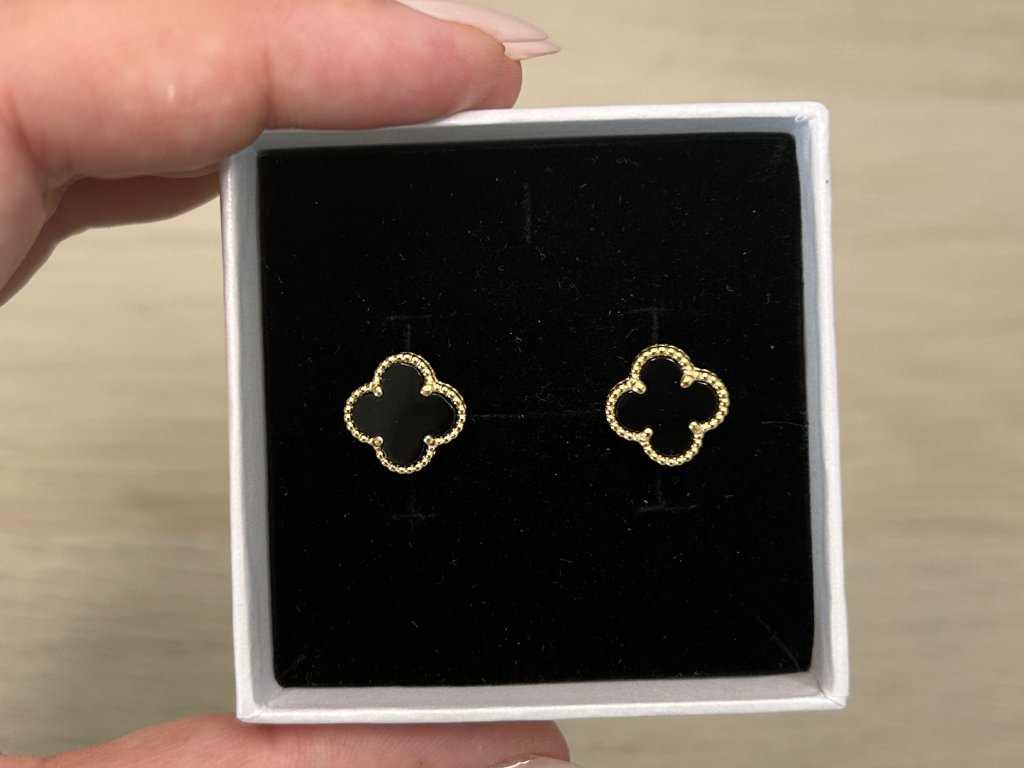 Stříbrné náušnice s černým achátem ve tvaru čtyřlístku pozlacené