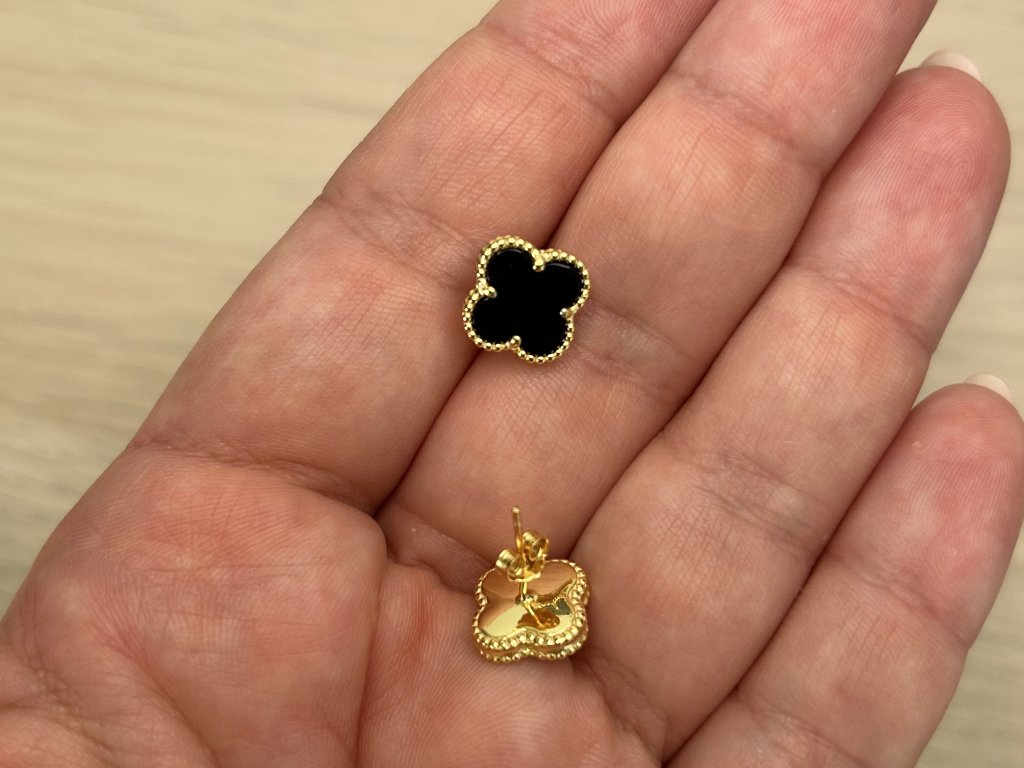 Design: Náušnice mají tvar jemně zaobleného čtyřlístku, jehož centrum tvoří černý achát. Okraj je zdoben drobným dekorativním perlováním, které dodává šperku zajímavý detail.