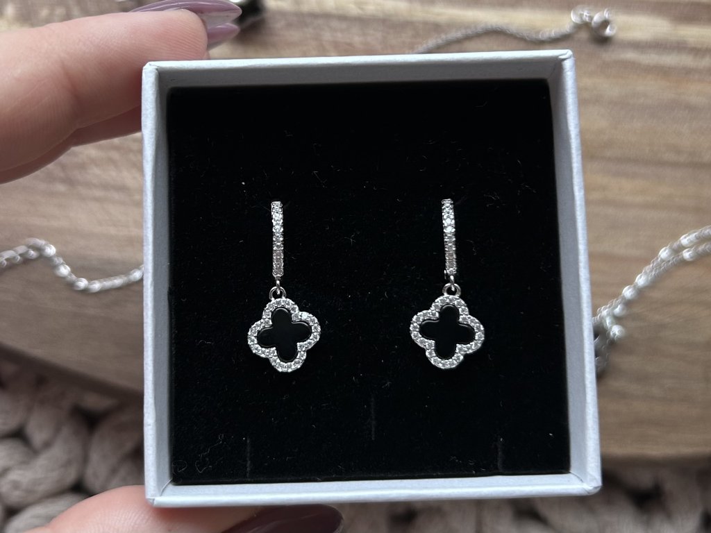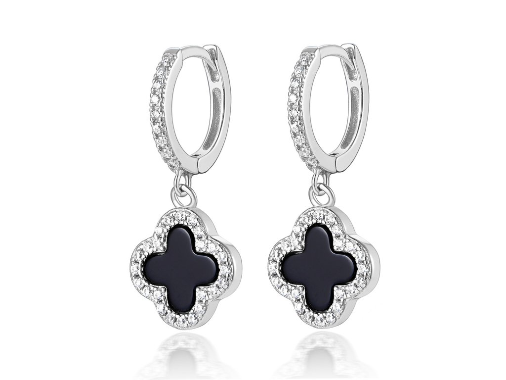 Stříbrné visací náušnice s černým achátem a zirkony ve tvaru čtyřlístku