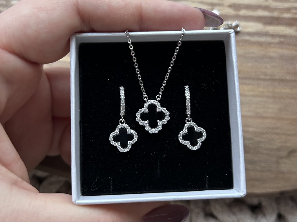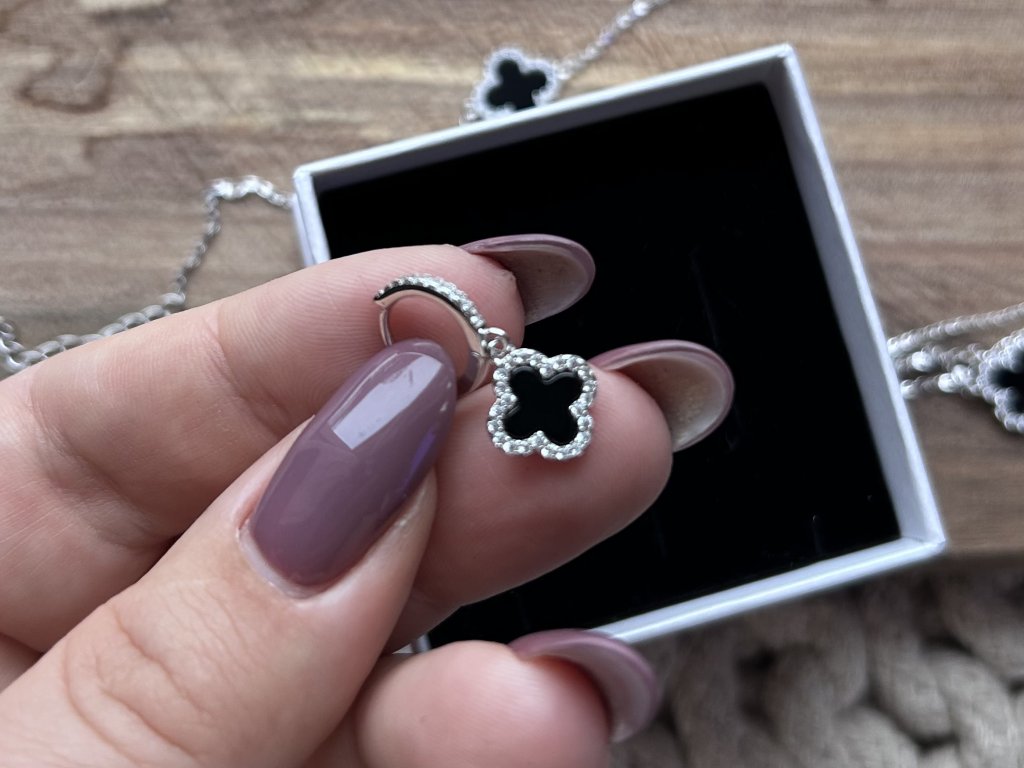 Design: náušnice jsou tvořeny výrazným přívěskem ve tvaru čtyřlístku z hluboce černého achátu, orámovaného elegantním korálkovým okrajem. Přívěsek je zavěšen na tenkém kroužku, osázeném drobnými čirými zirkony, které krásně odrážejí světlo a dodávají celému šperku jiskru. Design spojuje klasickou symboliku s moderním stylem a decentní elegancí.