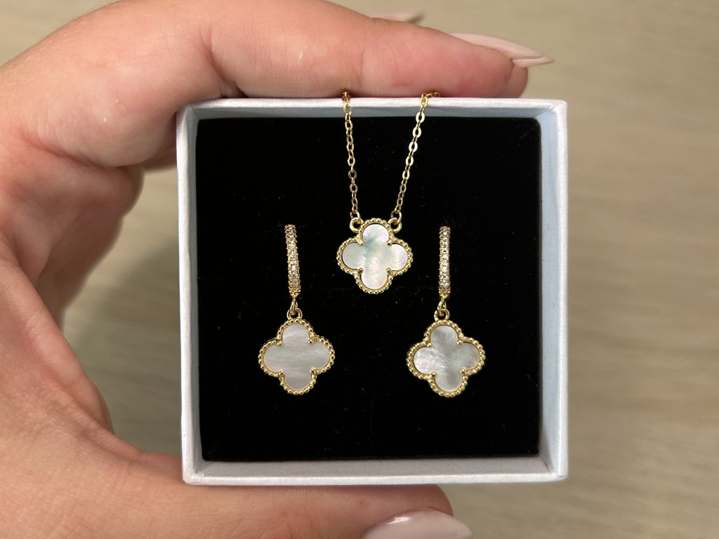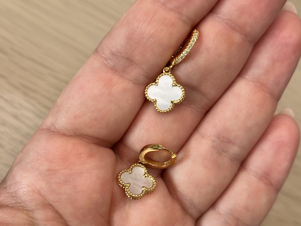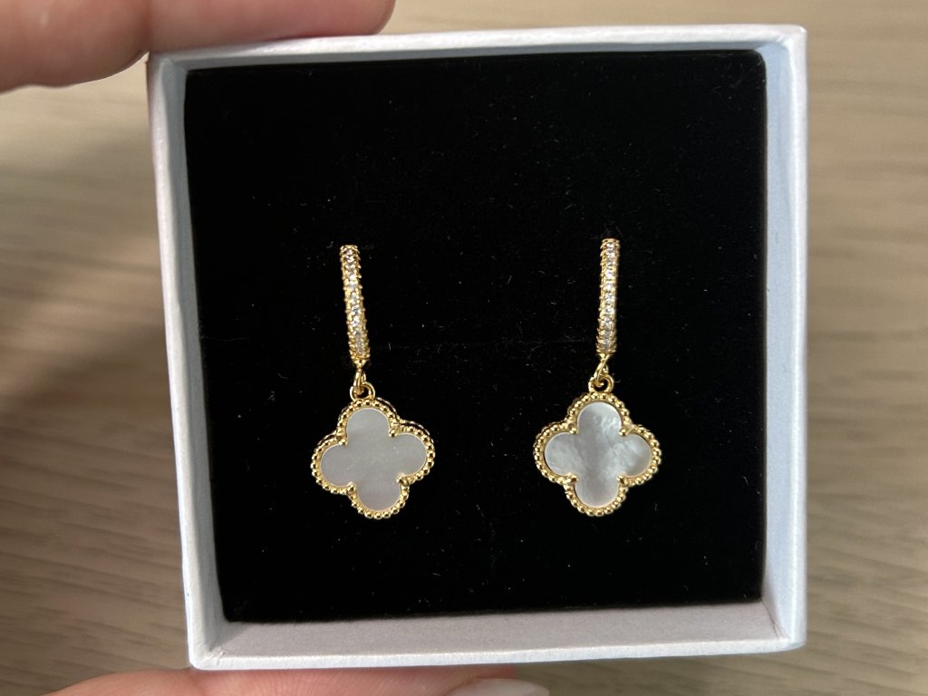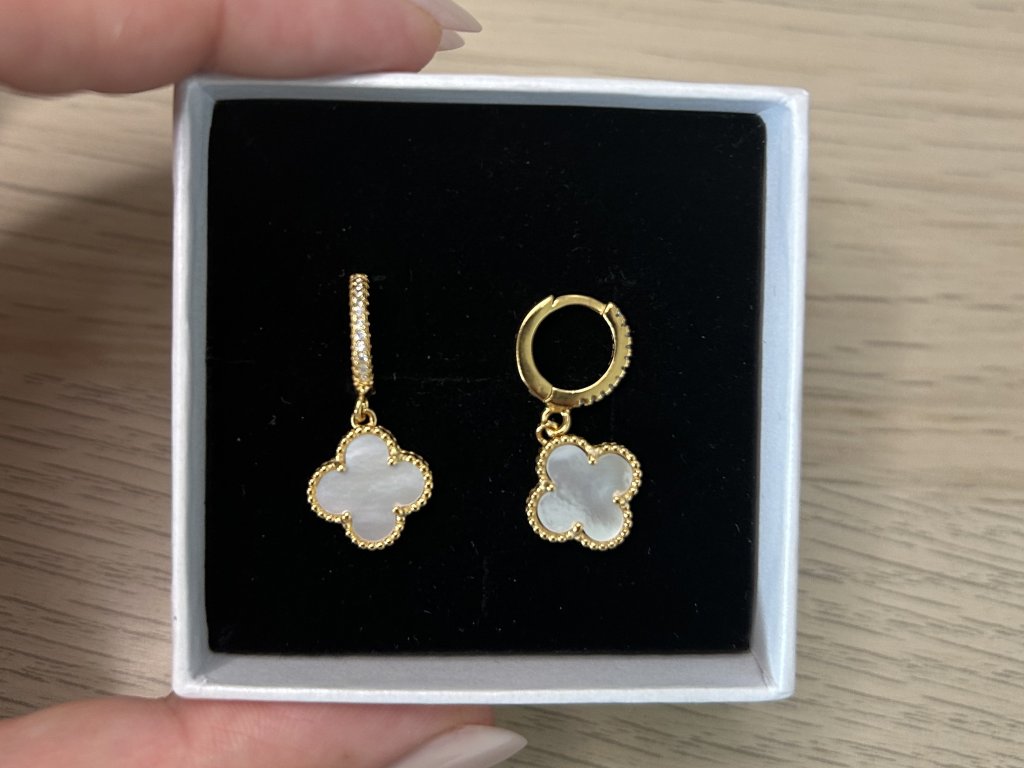 • Design: Decentní kruhové náušnice se zirkony a jemně zavěšeným motivem čtyřlístku z přírodní bílé perleti. Výrazný detail s jemným pohybem při nošení.