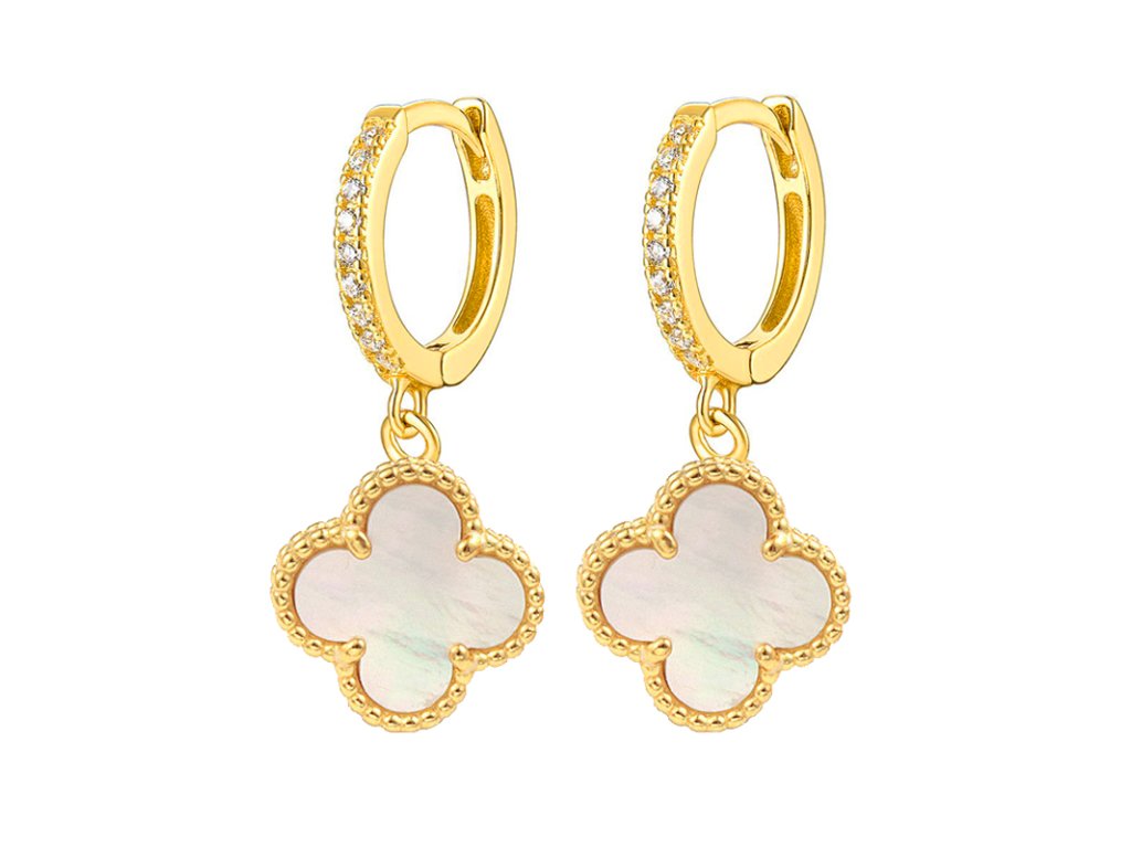 Stříbrné visací náušnice s perletí a zirkony ve tvaru čtyřlístku pozlacené