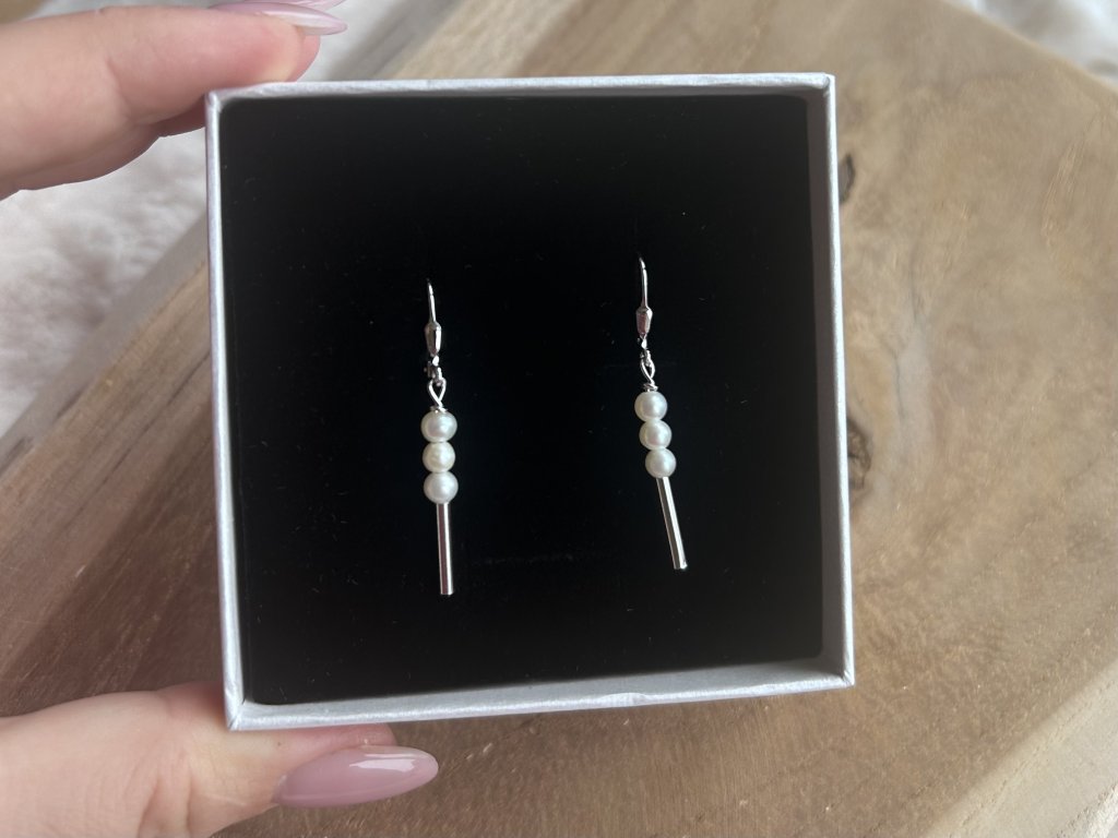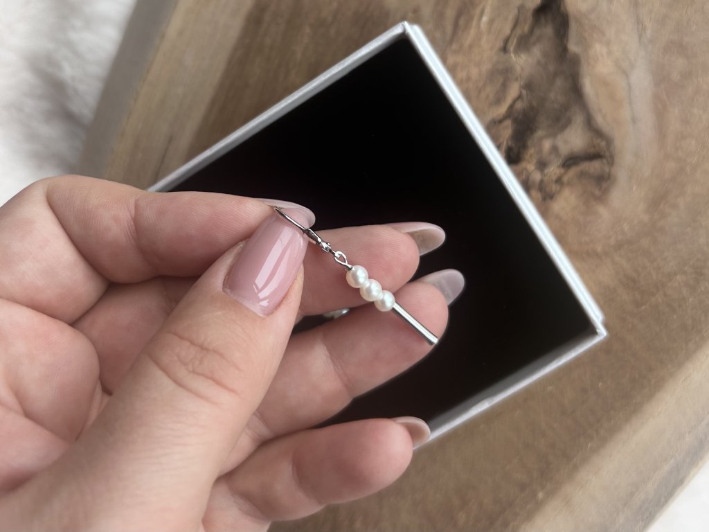 Design: Visací náušnice s třemi přírodními perlami a hladkou stříbrnou tyčinkou, které společně tvoří elegantní vertikální linii.