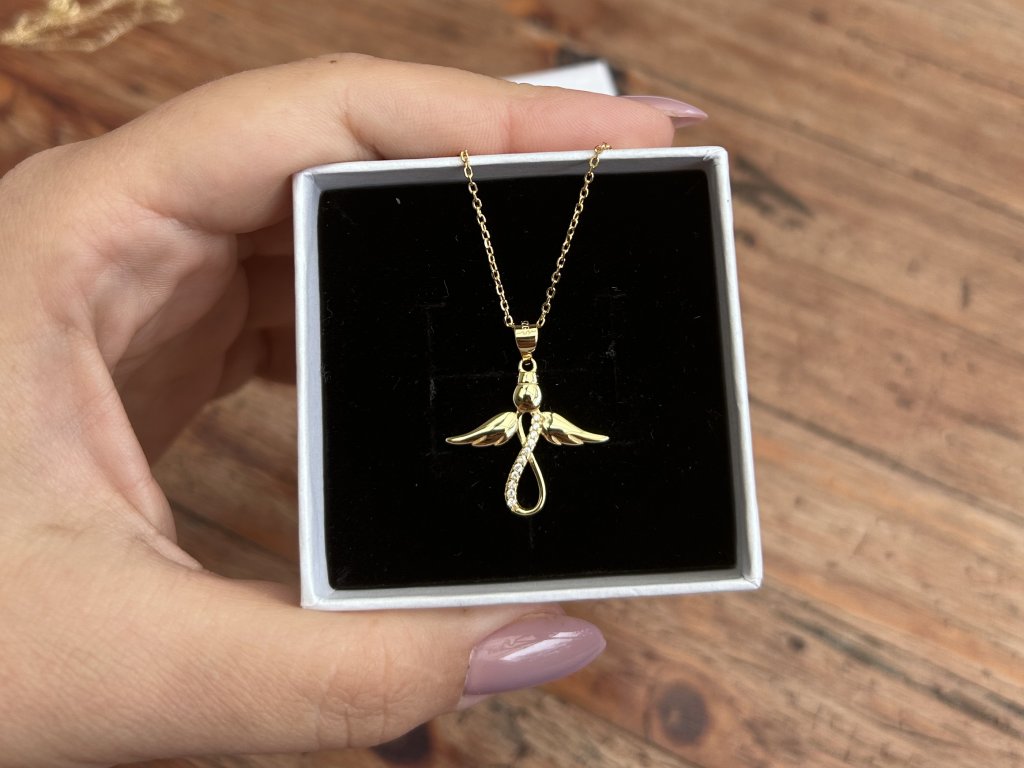 Design: Jemný řetízek s přívěskem anděla s čistými liniemi a třpytivými zirkony, nyní v luxusní pozlacené variantě. Symbolizuje světlo, ochranu a naději.