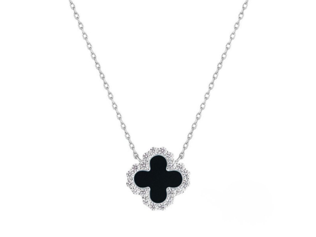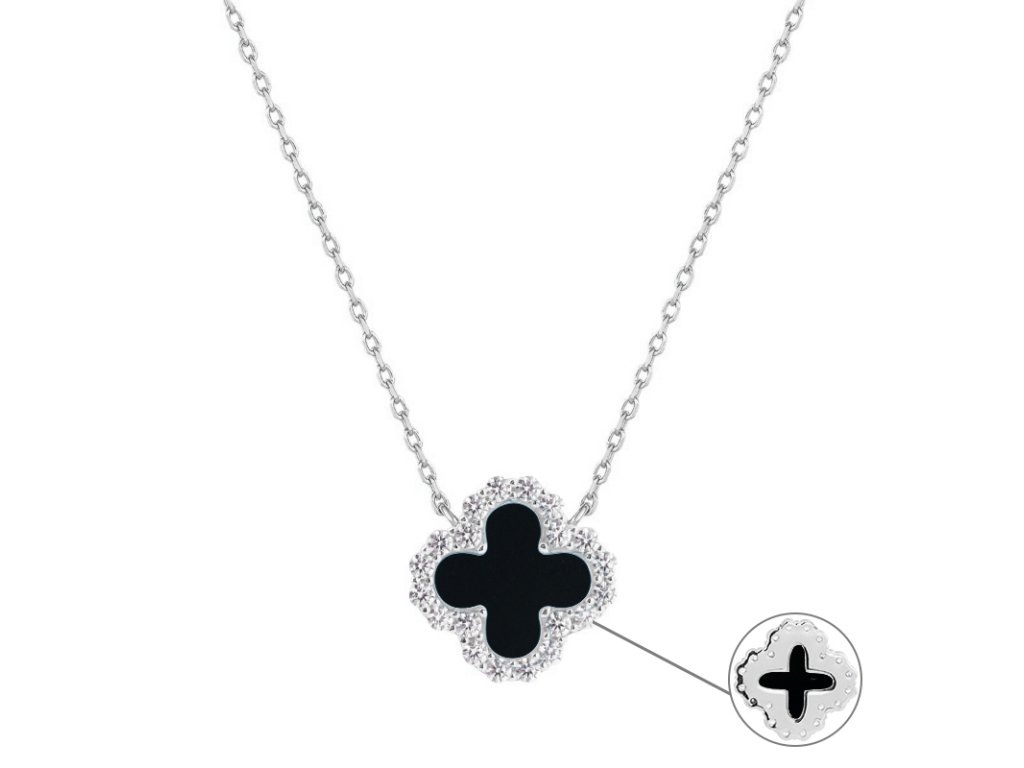 Stříbrný náhrdelník čtyřlístek s černým achátem a zirkony