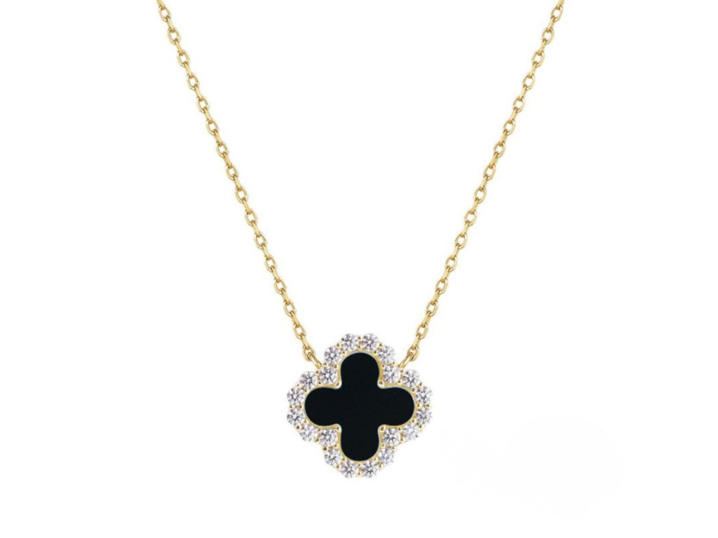 Design: Stylový čtyřlístkový přívěsek s černým achátem uprostřed je lemován zářivými čirými zirkony. Detailní obruba a teplý zlatý odstín vytvářejí elegantní kontrast s hlubokou černí kamene. Zavěšený na jemném pozlaceném řetízku. Celý šperk působí harmonicky a luxusně.