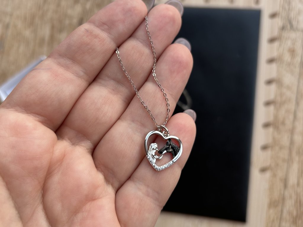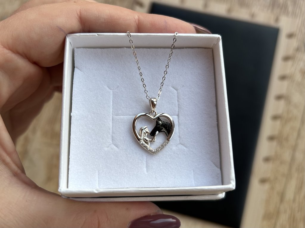 Design: Přívěsek ve tvaru srdce představuje něžný moment mezi dívkou a jejím koněm – motiv, který vyjadřuje lásku, oddanost a vzájemnou důvěru. Spodní část srdce je osazena čirými zirkony, které přidávají jemný třpyt. Černý kůň vytváří akcent, který krásně vystupuje na lesklém stříbrném základě.