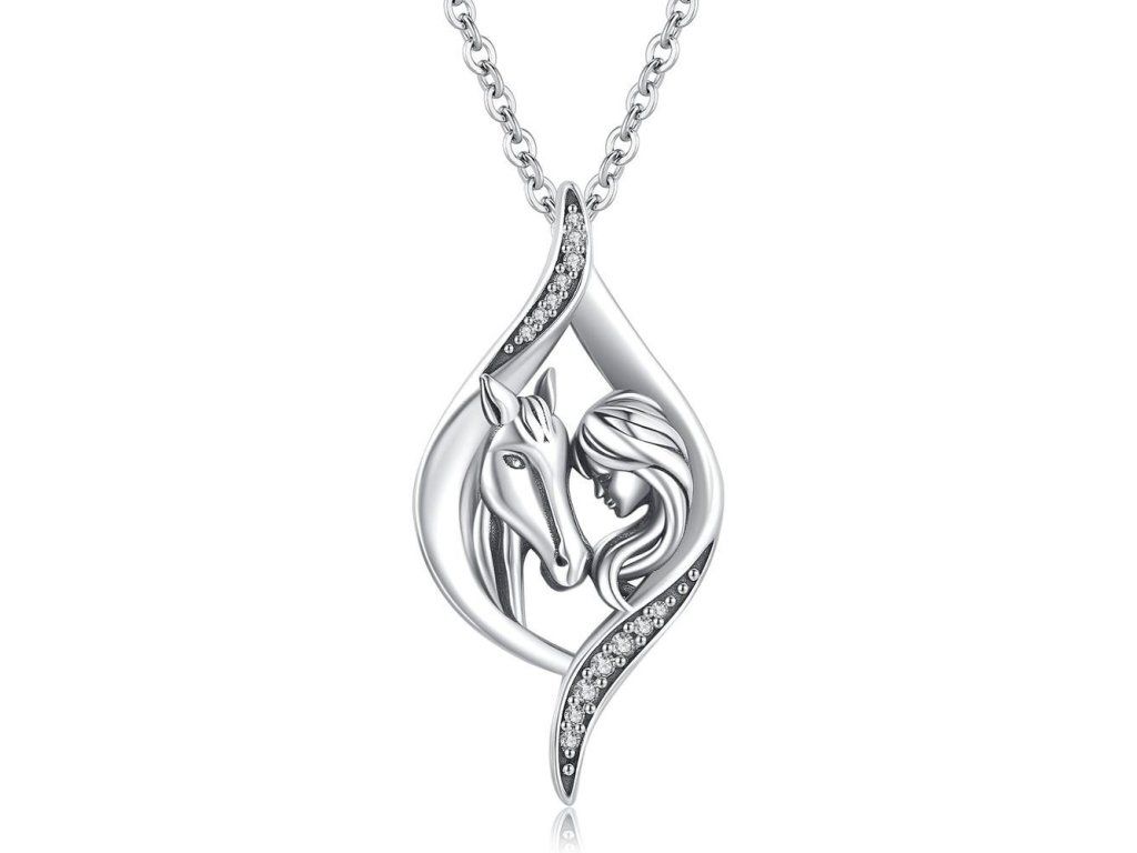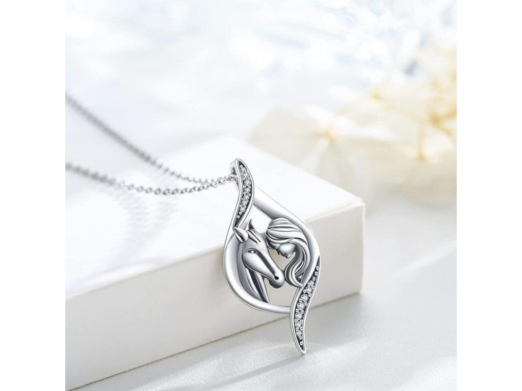 • Design: Detailně zpracovaný motiv dívky a koně v elegantním propleteném tvaru, doplněný linií čirých zirkonů pro jemný lesk.