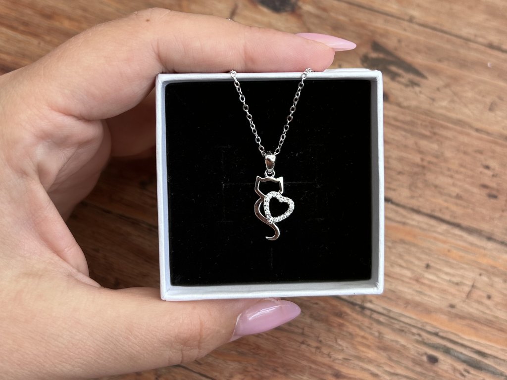 Stříbrný náhrdelník s kočkou a srdcem ze zirkonů