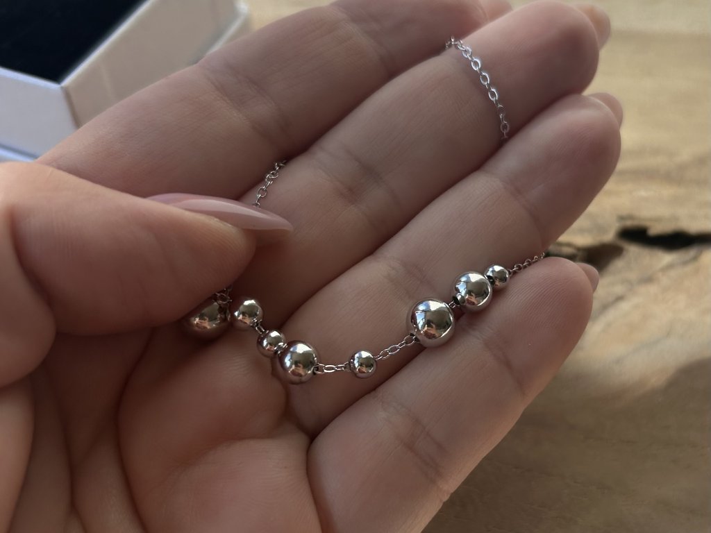 Stříbrný náhrdelník s lesklými kuličkami – hravá elegance v minimalistickém stylu