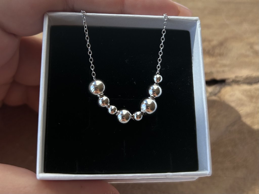 • Design: Náhrdelník tvoří pět kuliček různé velikosti v harmonickém rozložení. Tento rafinovaný design dodává celku dynamiku a eleganci. Kuličky jsou hladce leštěné, což vytváří krásný zrcadlový lesk, který odráží světlo a přirozeně přitahuje pozornost.