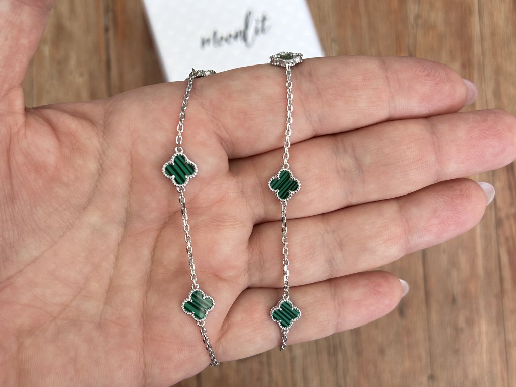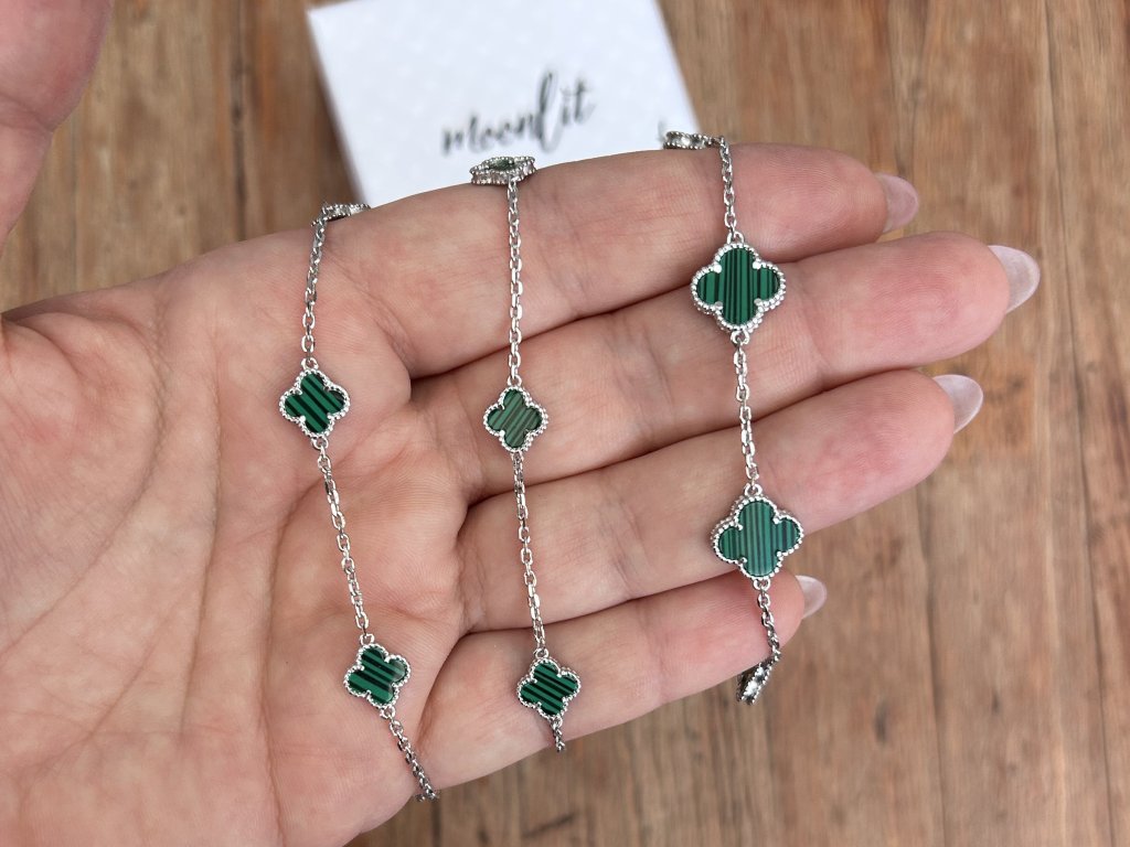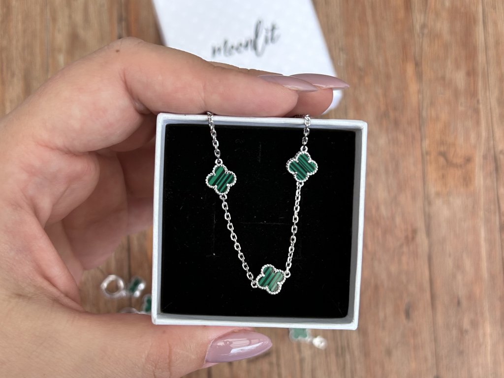 Design: Elegantní řetízek zdobený pravidelně rozmístěnými čtyřlístky se zeleným syntetickým malachitem. Kombinuje nadčasový motiv štěstí s moderním vzhledem.