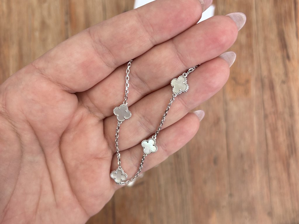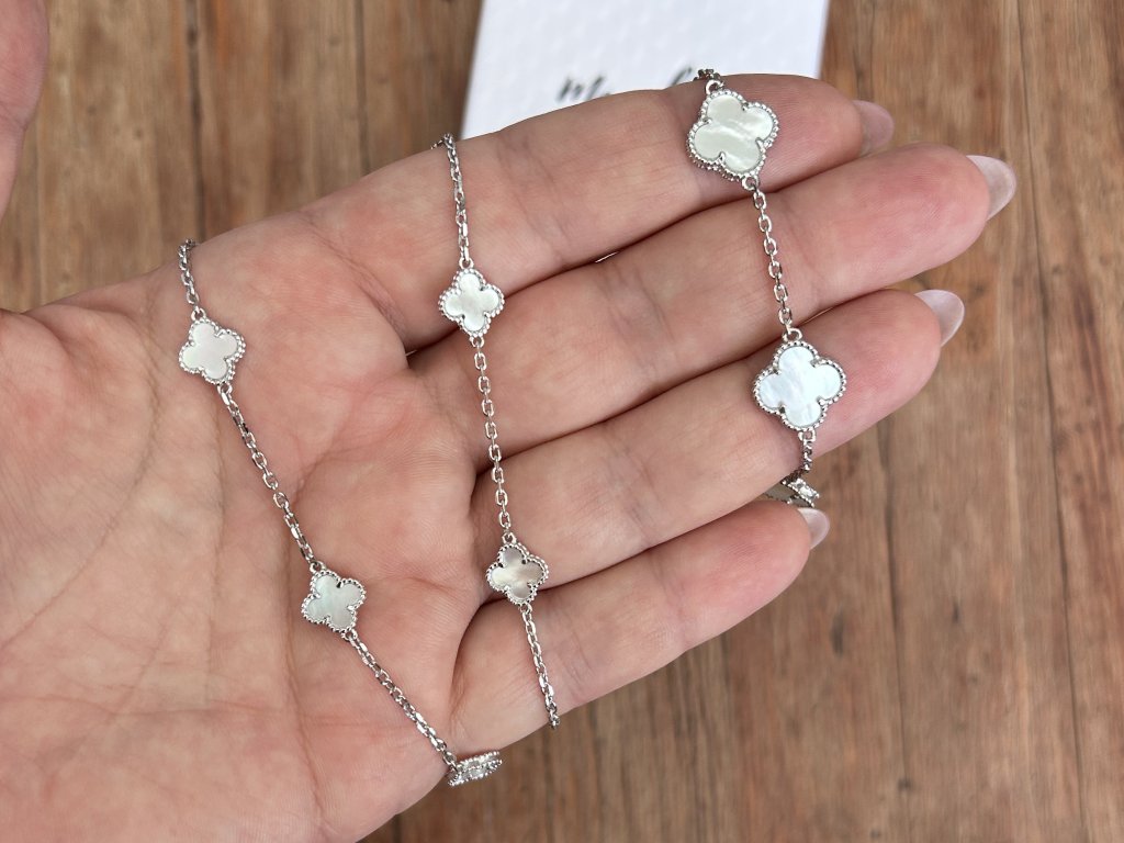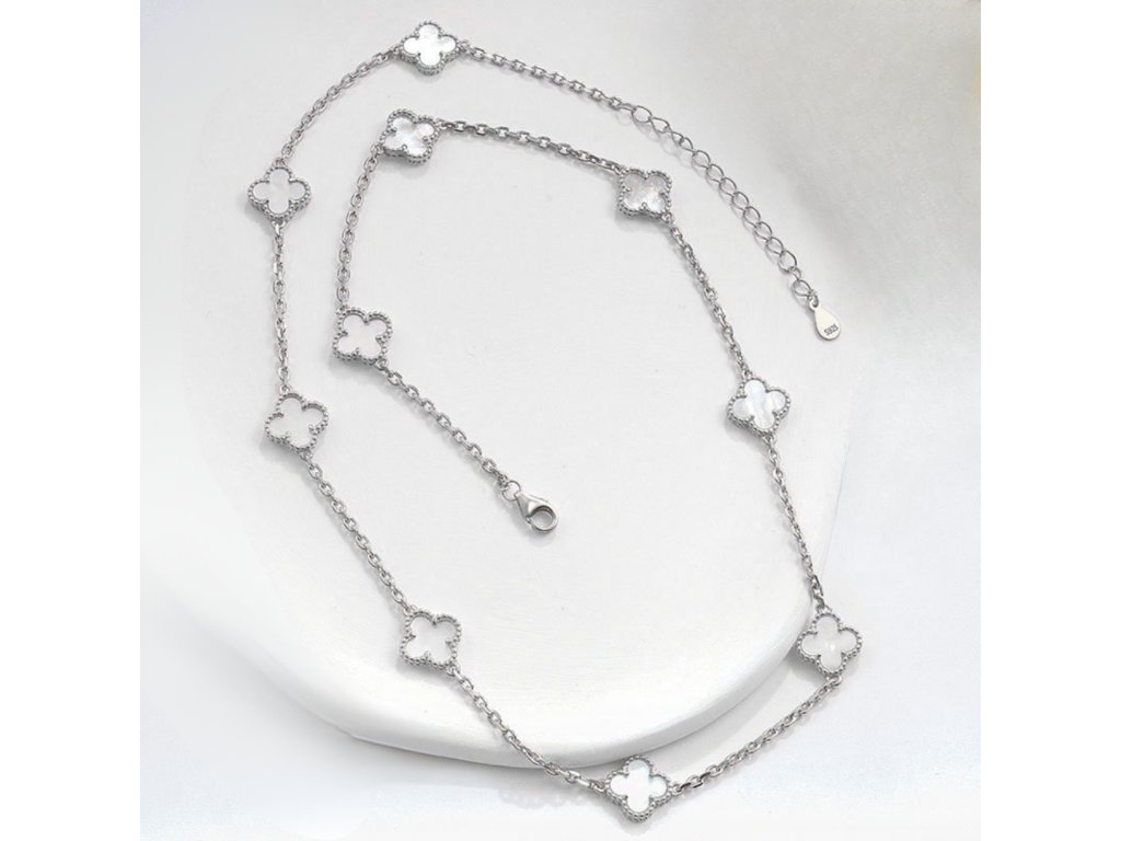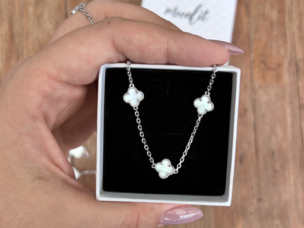 Design: Elegantní náhrdelník zdobený pravidelně rozmístěnými čtyřlístky s perletí. Jemný kontrast bílého lesku a stříbra působí sofistikovaně.