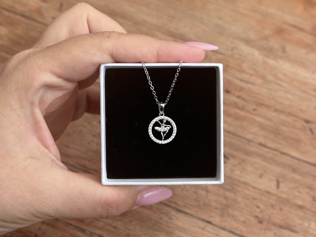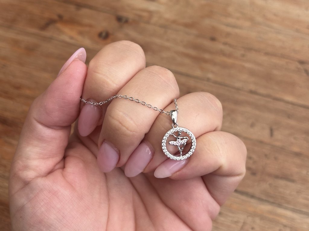 - Design: Náhrdelník s přívěskem tanečnice představuje krásnou kombinaci elegance a pohybu. Přívěsek obsahuje jemnou siluetu tanečnice, která je zasazena do kruhu ozdobeného třpytivými růžovými zirkony. Tento design zachycuje ladnost a dynamiku tance a působí velmi jemně a umělecky, což z něj činí ideální doplněk pro ty, kteří milují tanec nebo hledají stylový, elegantní šperk.