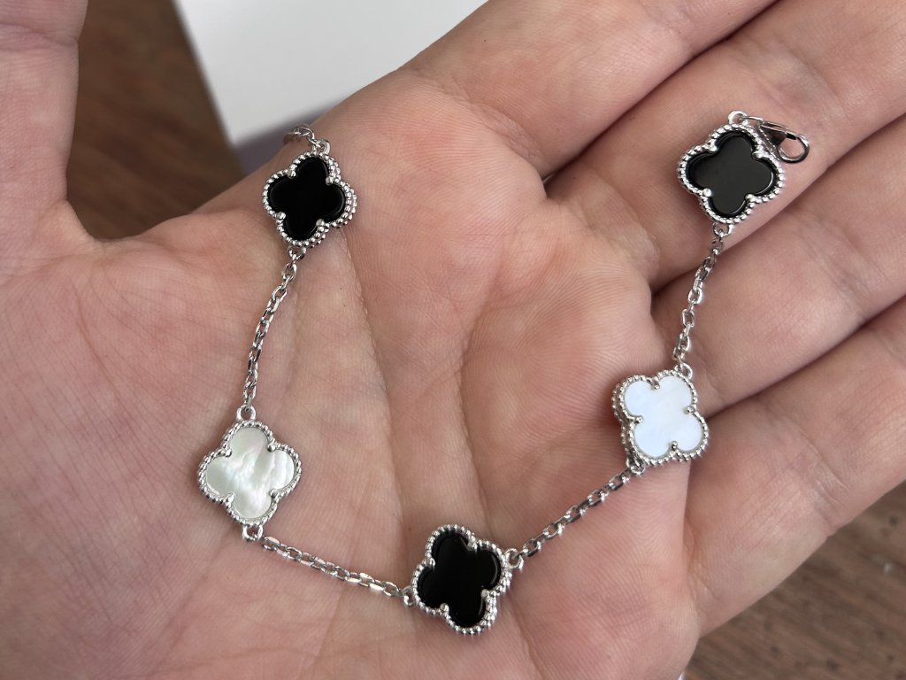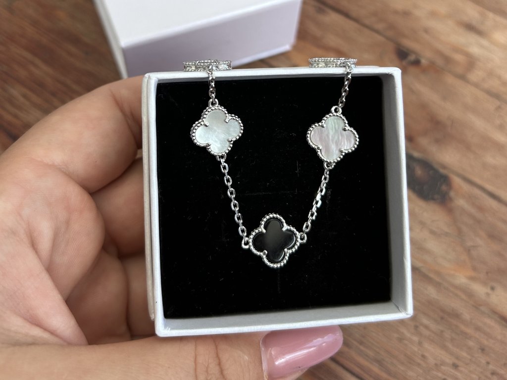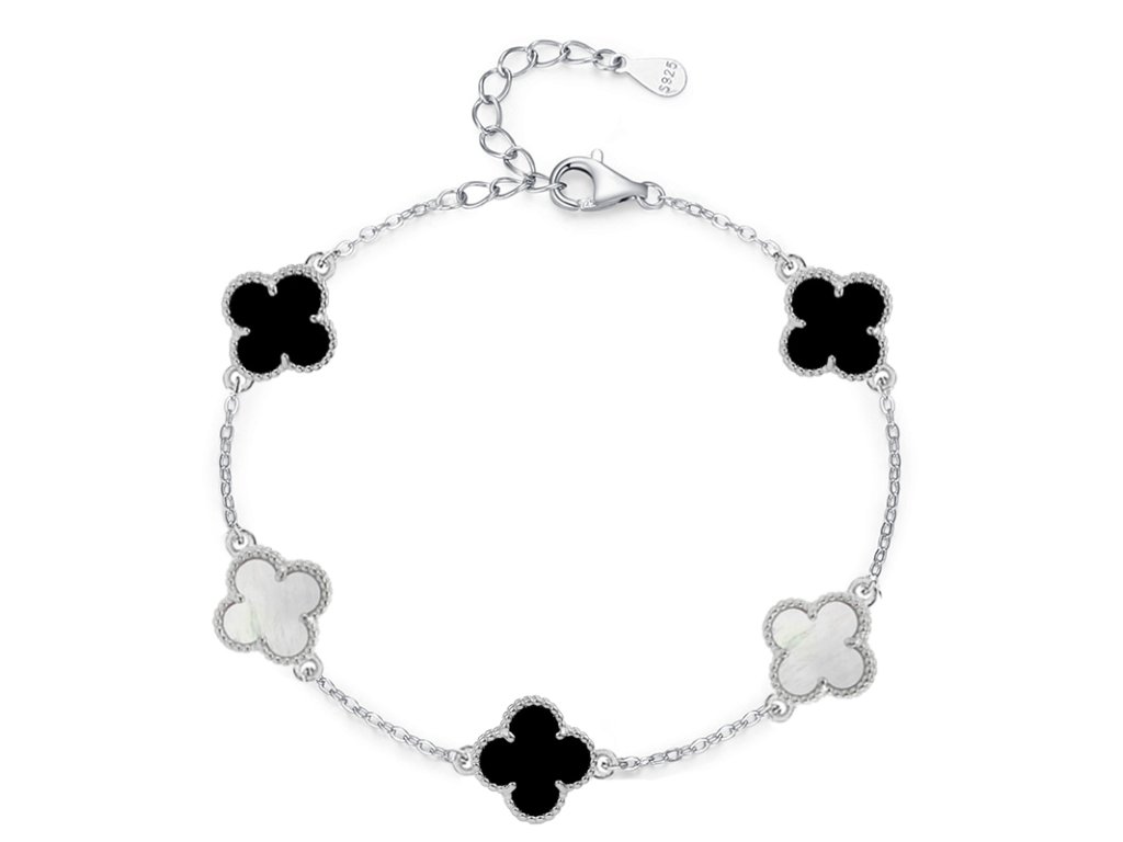 Design: Elegantní náramek s pěti čtyřlístky, které střídají bílou perleť a černý achát. Kontrast světlého a tmavého kamene dodává šperku moderní a nadčasový vzhled, zatímco jemné stříbrné lemování umocňuje jeho čistotu a eleganci.