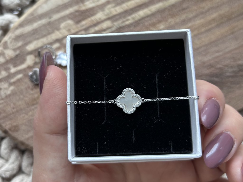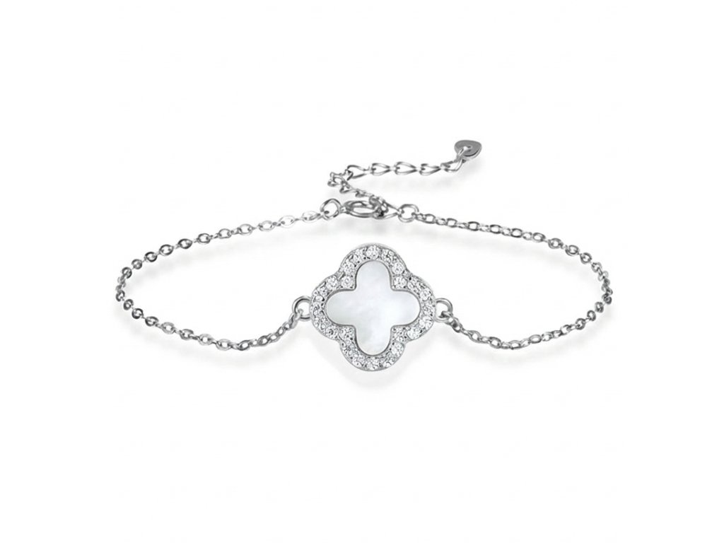 Stříbrný náramek s čtyřlístkem z perleti a zirkony