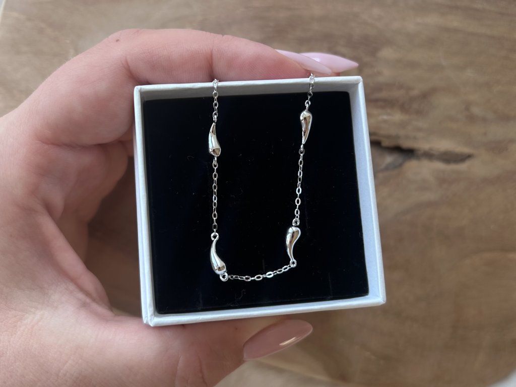 Design: Jemný řetízek zdobený několika hladkými kapkovými přívěsky v elegantním organickém tvaru. Minimalistické a velmi ženské provedení.