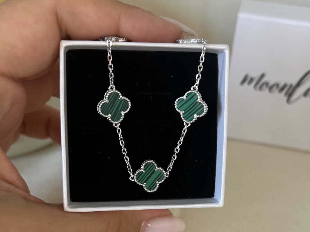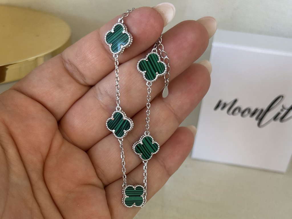 • Design: Výrazný náramek tvořený pěti motivy čtyřlístků, které symbolizují štěstí a rovnováhu. Barevné kameny v zeleném odstínu dodávají šperku hloubku a originalitu, zatímco rhodiovaná úprava mu propůjčuje lesk a odolnost.