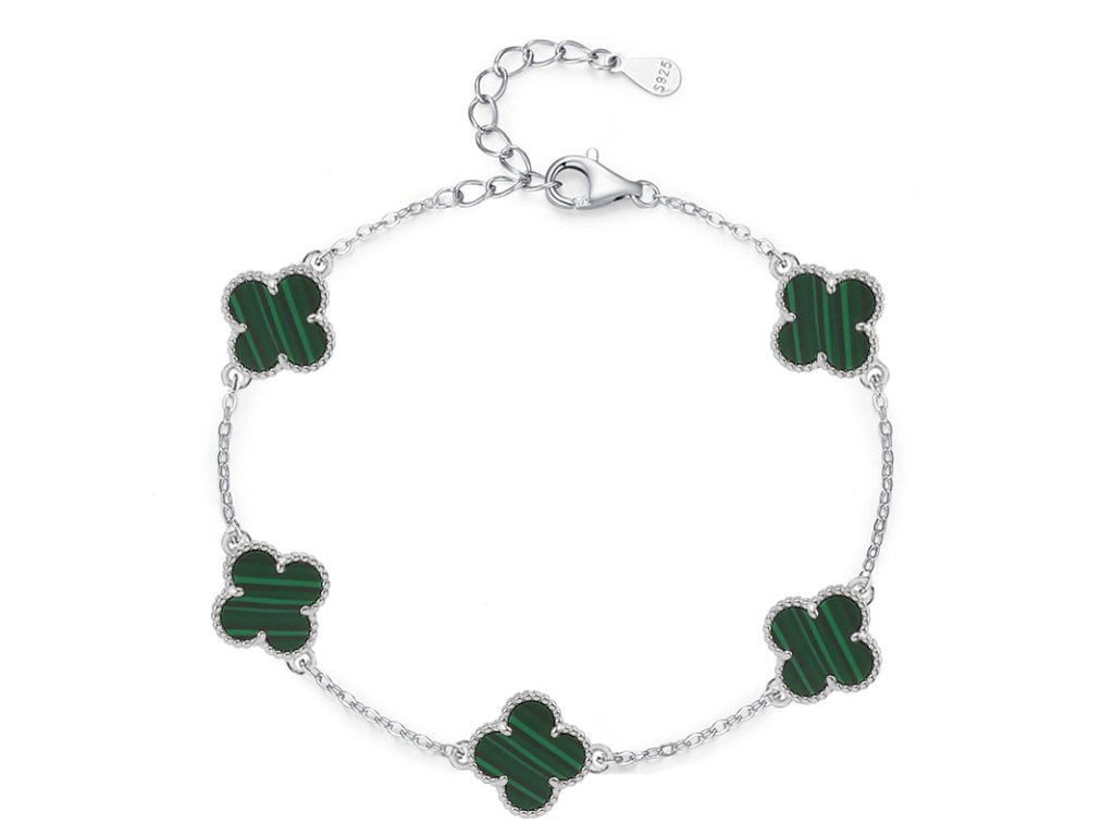 Stříbrný náramek s malachitem a motivem čtyřlístku