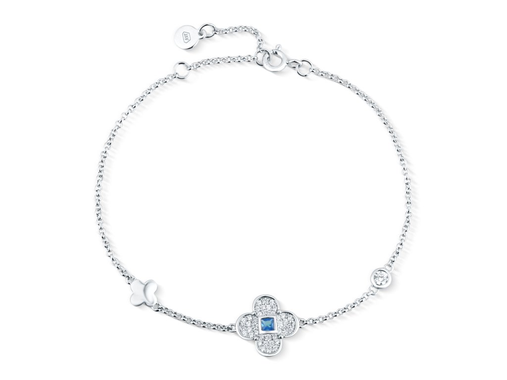 Design: Elegantní náramek se středovým přívěskem ve tvaru květu. Centrální modrý kámen dodává šperku hloubku a čiré zirkony vytvářejí zářivý kontrast.